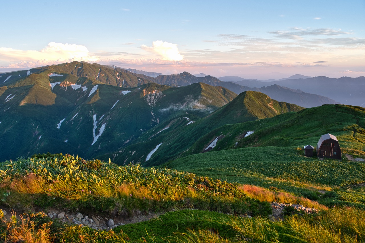 小屋の前から朳差岳がよく見えています。飯豊連峰は登山口までやってくるのには大変な苦労をしますが、一度稜線まで登ってさえしまえば、避難小屋が多くあるため縦走登山のハードル自体はそこまで高くありません。
