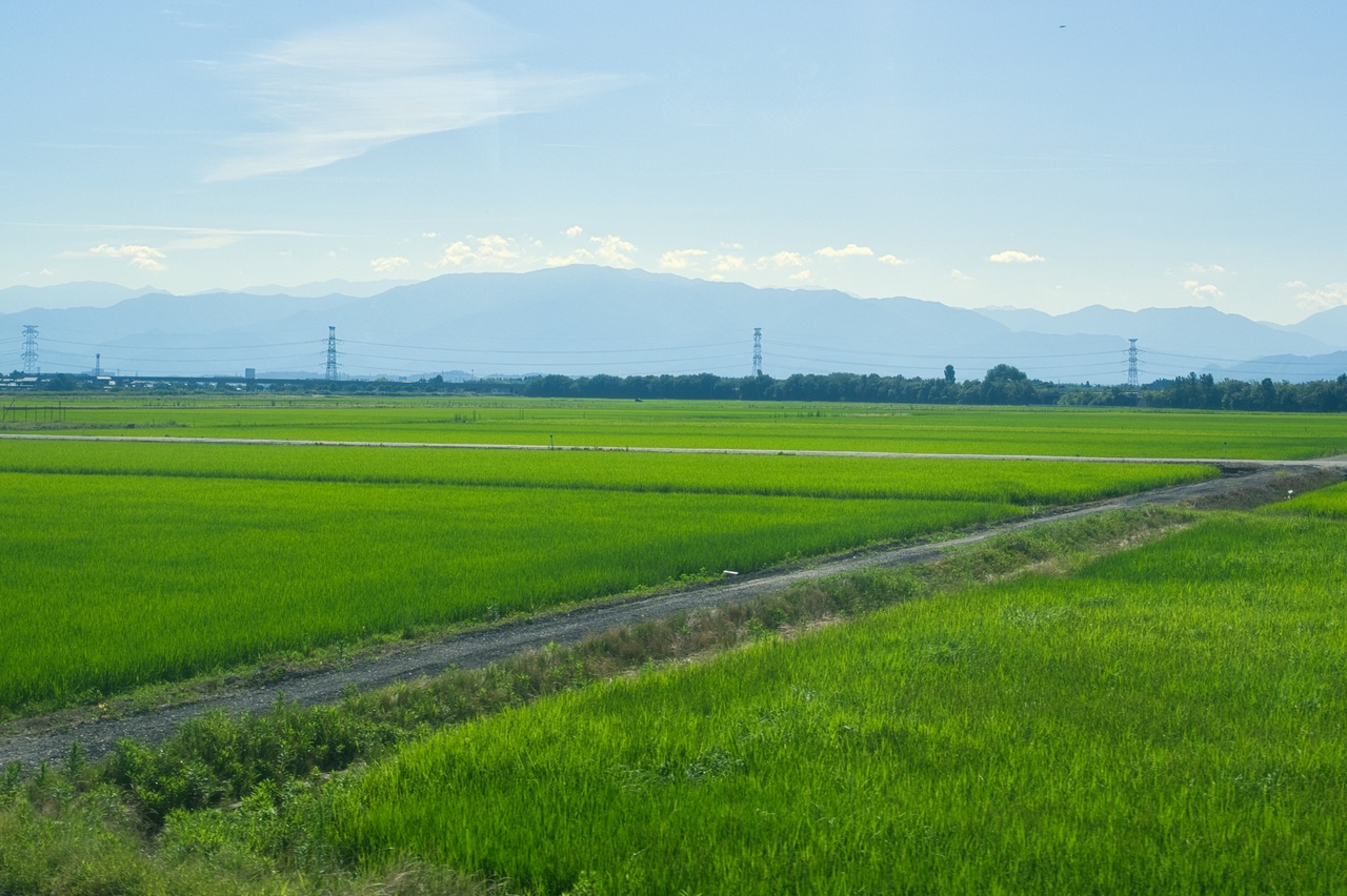 いかにも米所新潟らしい田園風景の先に、飯豊連峰前衛部の山が見えています。いまのところお天気は上々ですが、その分暑さに苦しめられることになりそうです。