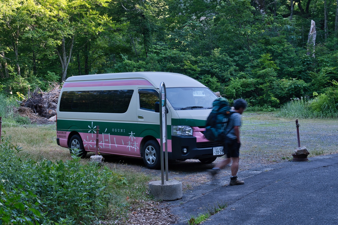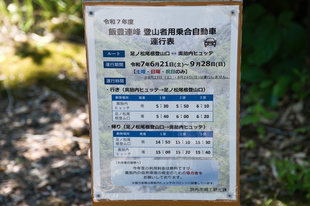 特定日のみの季節運航ですが、奥胎内ヒュッテから足の松尾根登山口まで無料の乗合自動車が運航しています。奥胎内ヒュッテの宿泊者以外でも利用は可能ですが、早朝時間帯の便しかないので実質宿泊者とマイカー組専用と言ったところです。