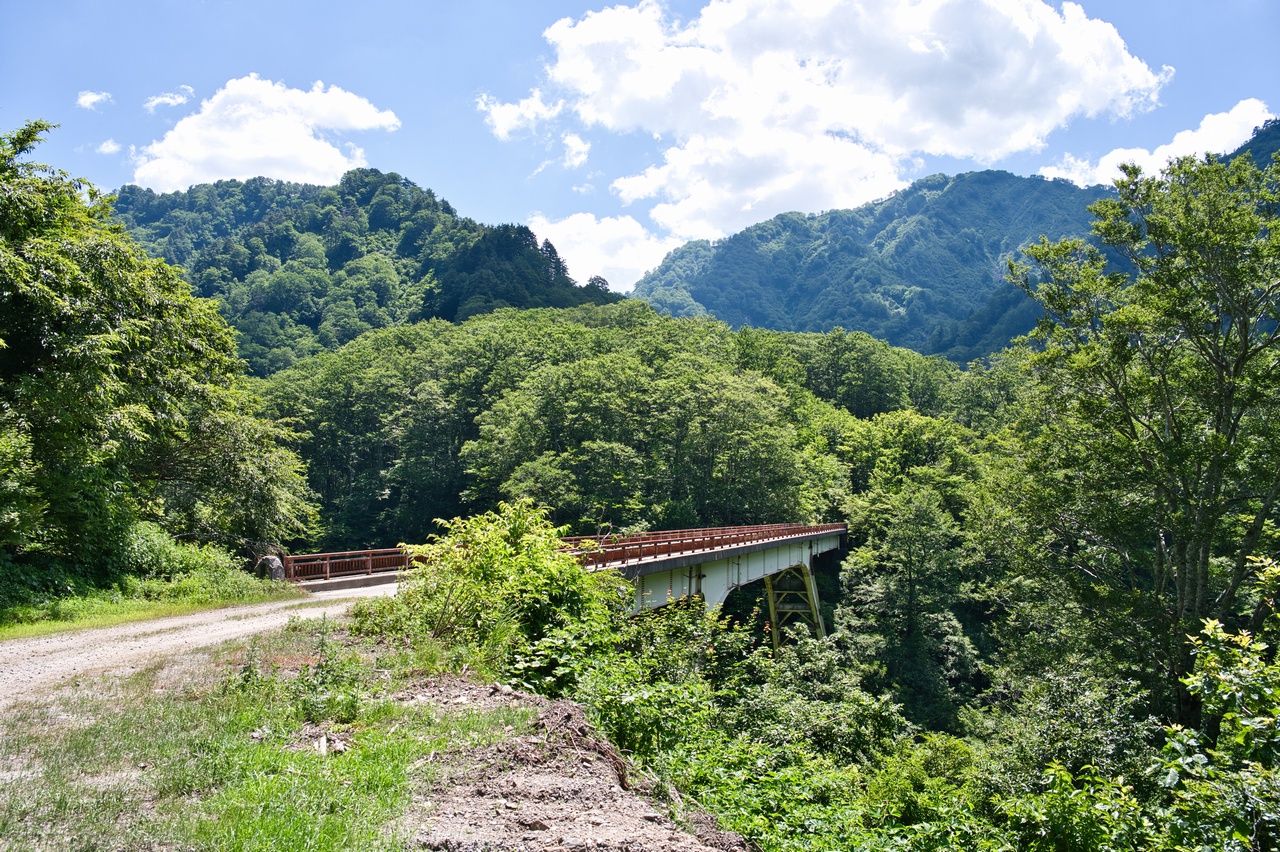 谷に橋が架かっていますが、対岸へは渡らずに道なりに進みます。この橋の先には奥胎内ダムがありますが、ゲートがあり一般者の立ち入りは出来ないダムです。年に何回か新潟県主催の見学ツアーがあり、その時だけは入れるようです。