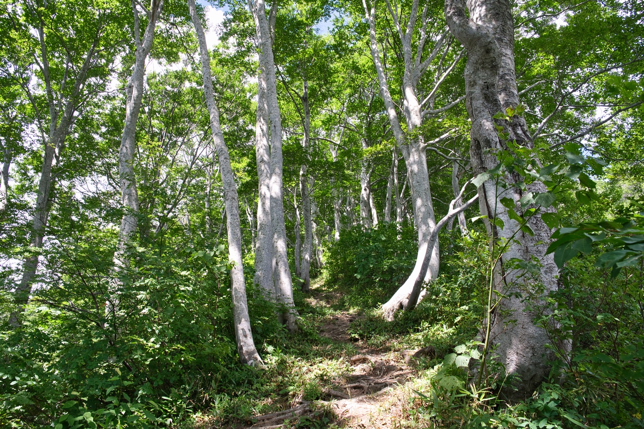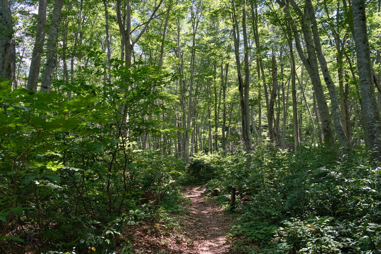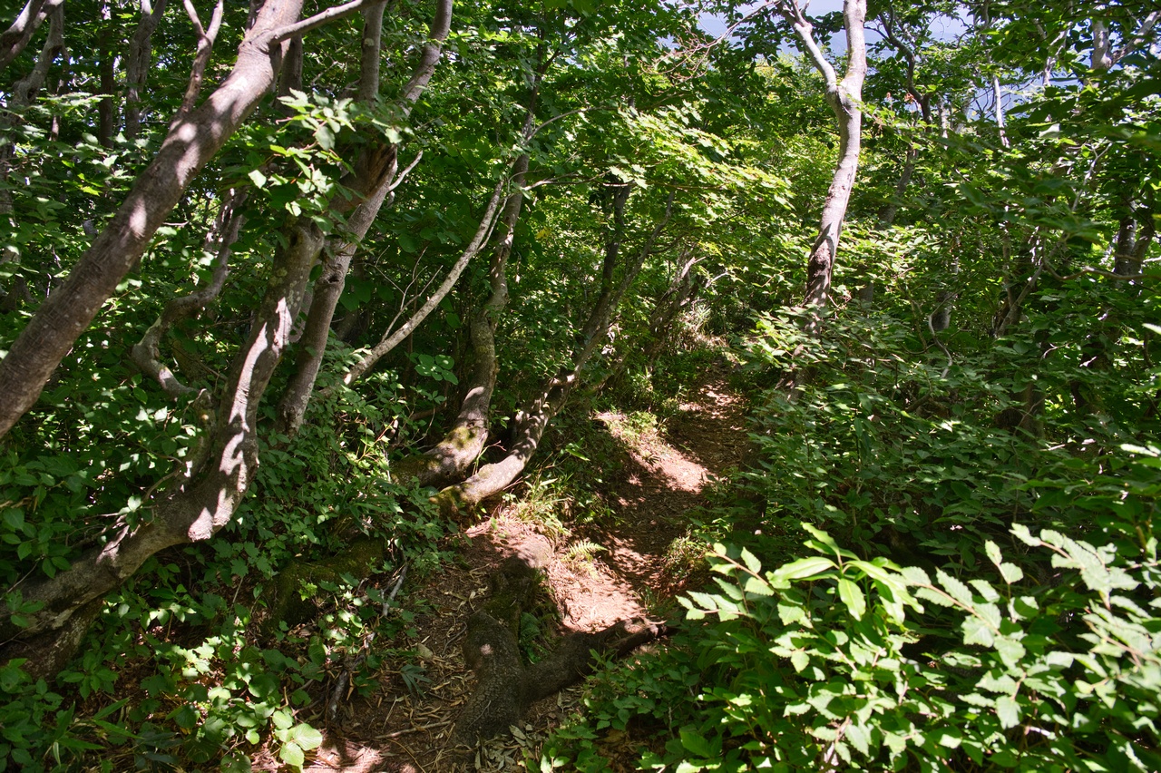 と言うことでようやく待望の樹林帯の中へと下ってきた訳なのですが、森の中は風がそよとも吹かないため、少しも涼しくはないです。まあそれでも、日差しがないだけでまだいくらかマシではあります。
