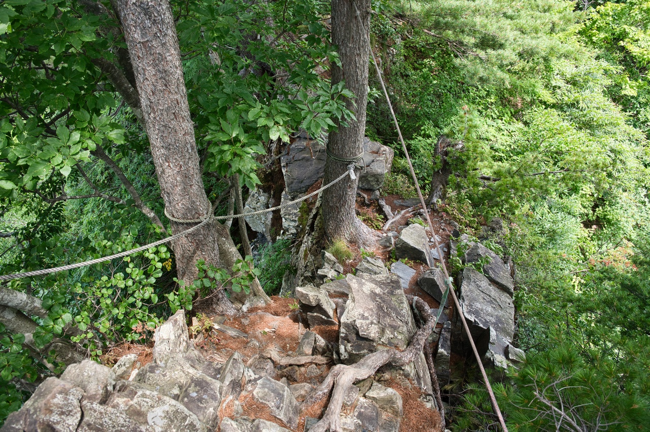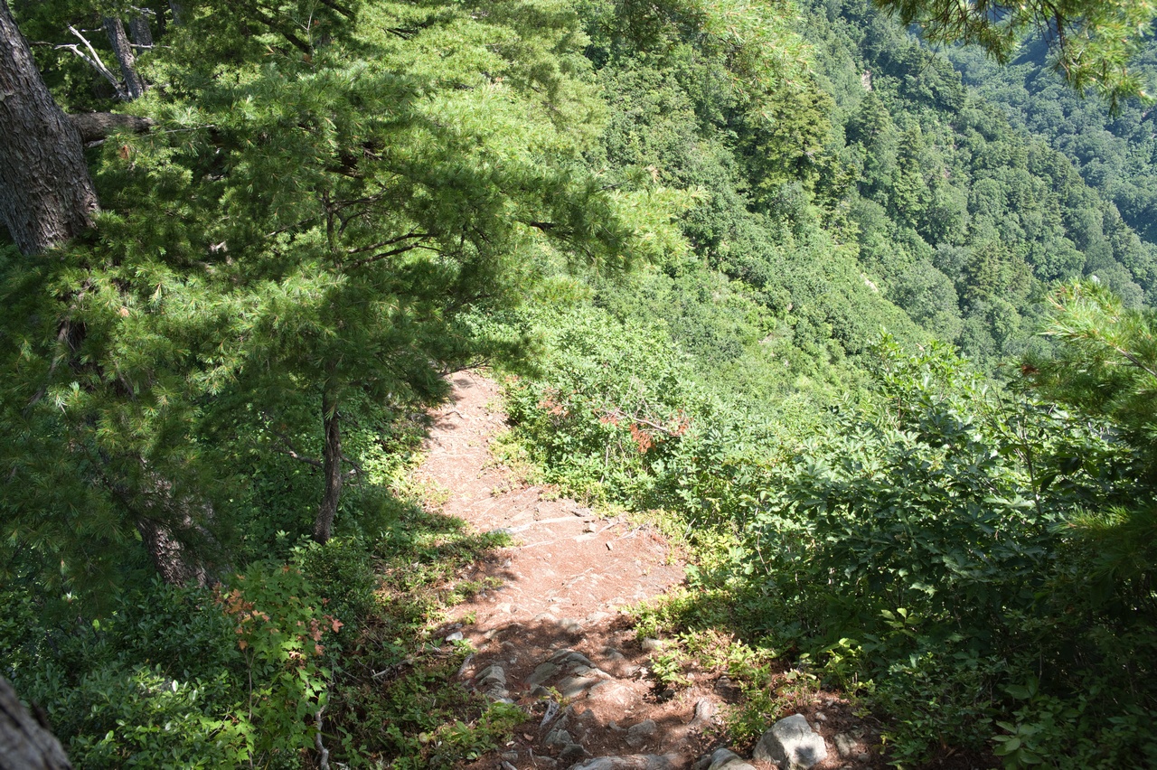 岩の細尾根の上に、松が絡みつくようにして生えています。両脇に樹木があるおかげでだいぶ高度感が緩和されていますが、かなり細くなっている個所もあります。足元は要注意です。