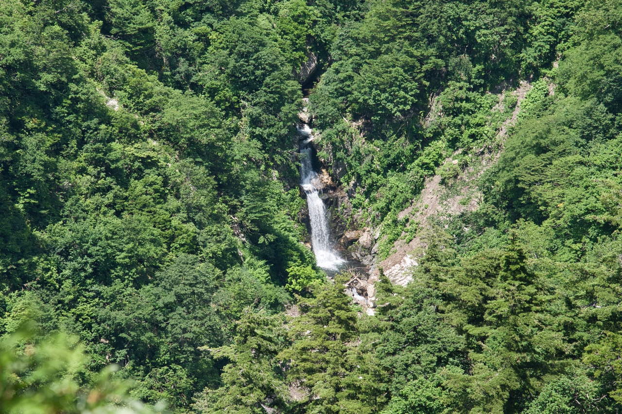 谷底をのぞきこんで見ると、なるほど足ノ松沢にある2段の滝が見えています。わざわざ滝見場と銘打たれた場所まであるのに、特に名前はないようです。