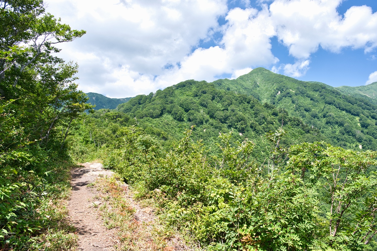 前方に飯豊連峰の主稜線が見えいています。標高で言うと2,000メートルもないのですが、スタート地点の標高自体もあまり高くはないため、標高差はそれなりにあります。