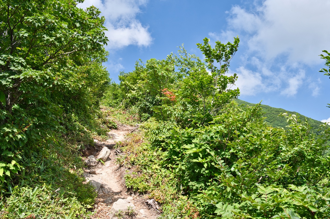 登り始める前の時点からからすでにこんな暑いとあっては、森林限界を越えた稜線に出て以降は大丈夫なんだろうかと、前途に不安しかありません。