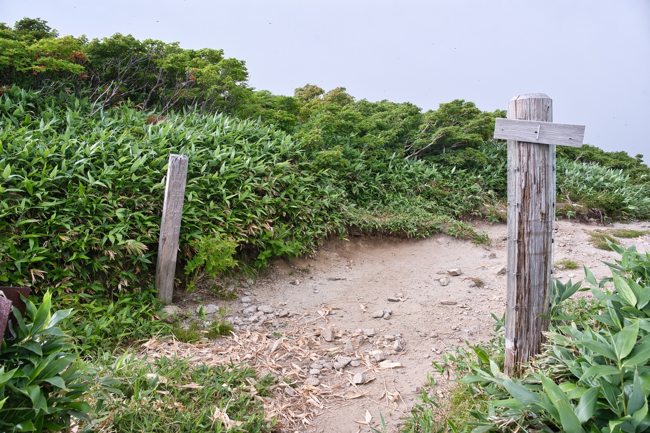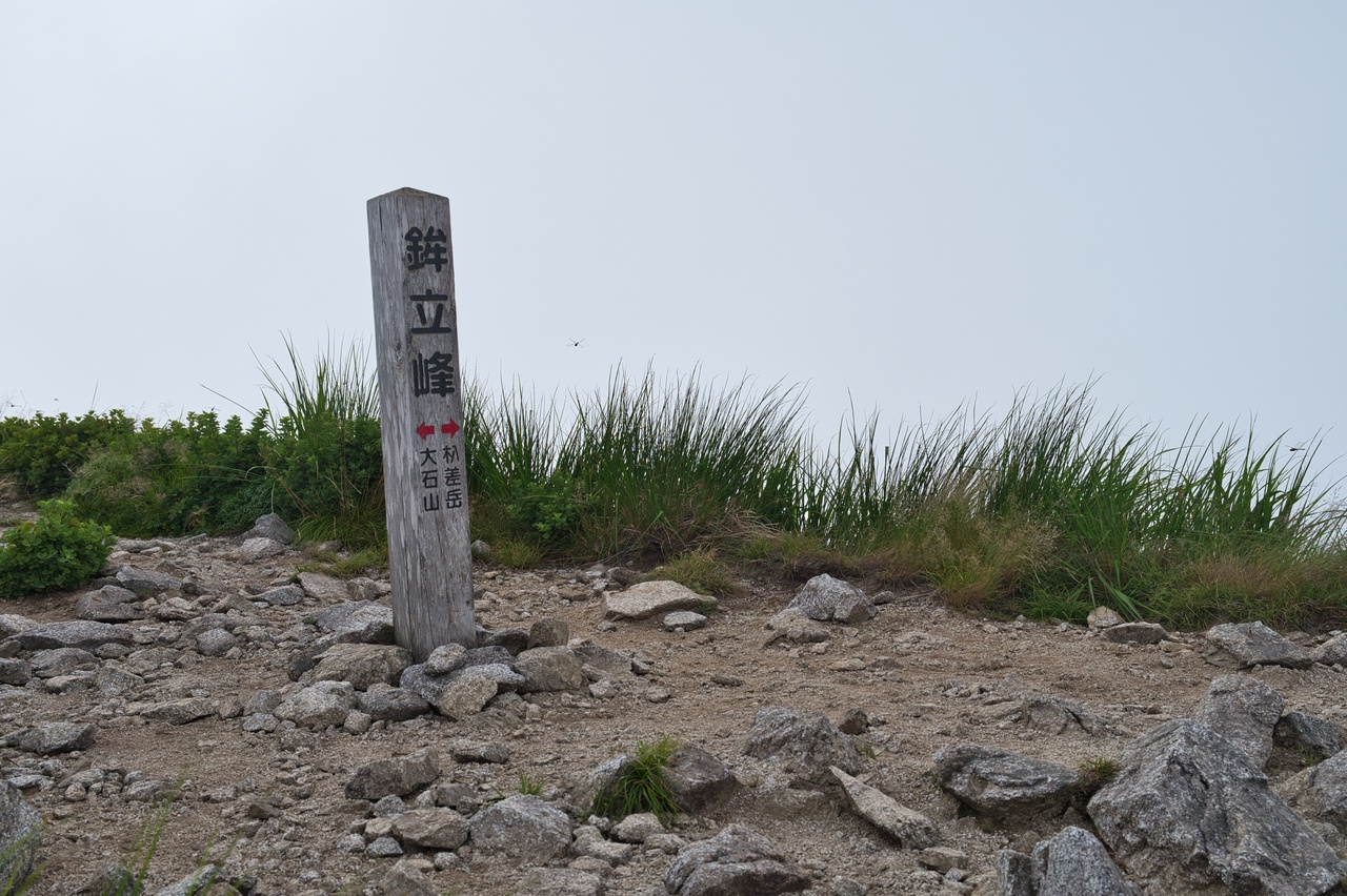 反対側の朳差岳方面も同じく雲に覆われており、手前にある鉾立峰だけがかろうじて見えている状態です。普段であれば展望が台無しなったことに落胆する場面なのですが、今はひたすらこのまま晴れないこと願うばかりです。