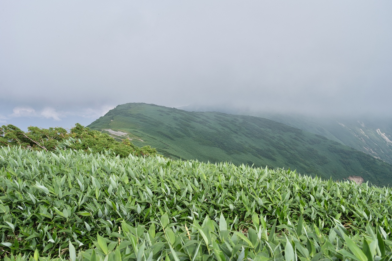 何時しか樹木は完全になくなり、周囲は笹の稜線になりました。日影が全くないこの状況を見るに、行動中断という判断は間違っていなかったように思えます。