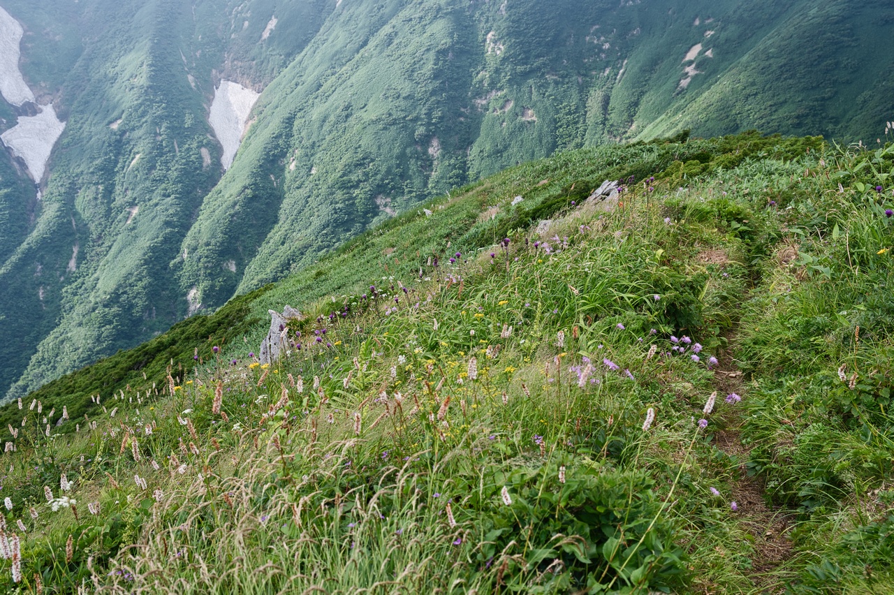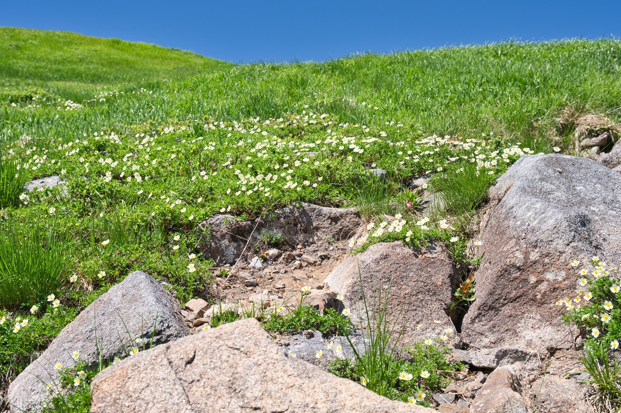 様々な種類の高山植物が花を咲かせており、まさしく百花繚乱状態です。もう少し早い時期だと、稜線上の一面がハクサンイチゲに覆いつくされるのですが、もうすでに1輪も残ってはいませんでした。