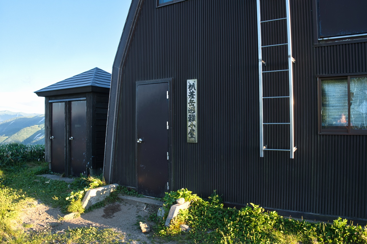 7時50分 頼母木山避難小屋まで歩いて来ました。朳差岳避難小屋よりはやや小さく、収容人数は30人ほどです。こちらの小屋には、夏の間管理人が常駐しています。