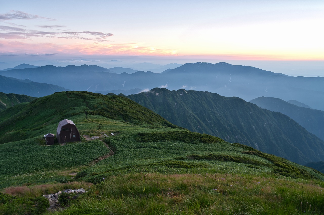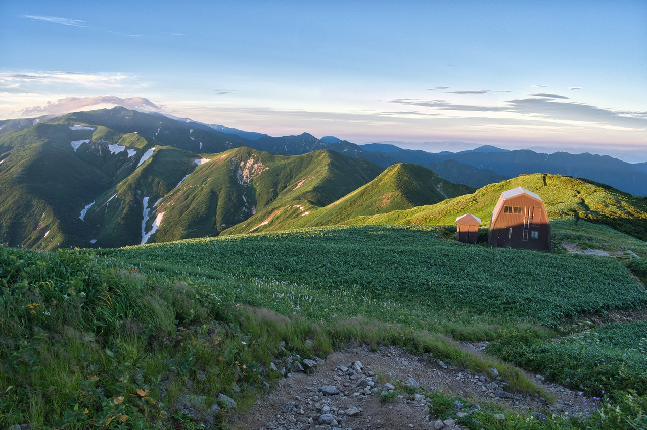 振り返って見た頼母木小屋です。大変すばらしいロケーションではありますが、荒天時には風雨の影響をモロに受けそうで、冬の間に潰れてしまわないか心配になってきます。