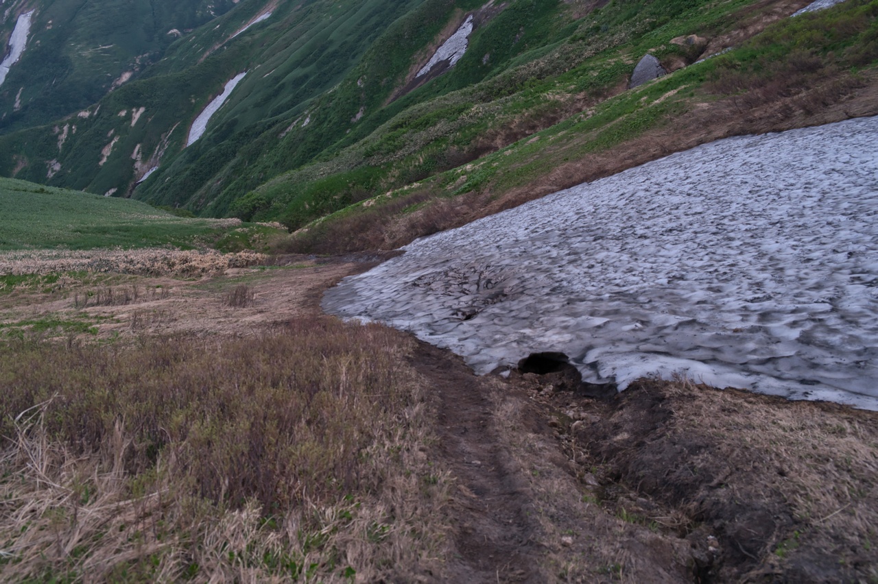 7月下旬時点でも、かなりの大きの雪渓が残っています。念のためチェーンスパイクは用意してきていますが、今のところ登山道上に残っているものはありません。