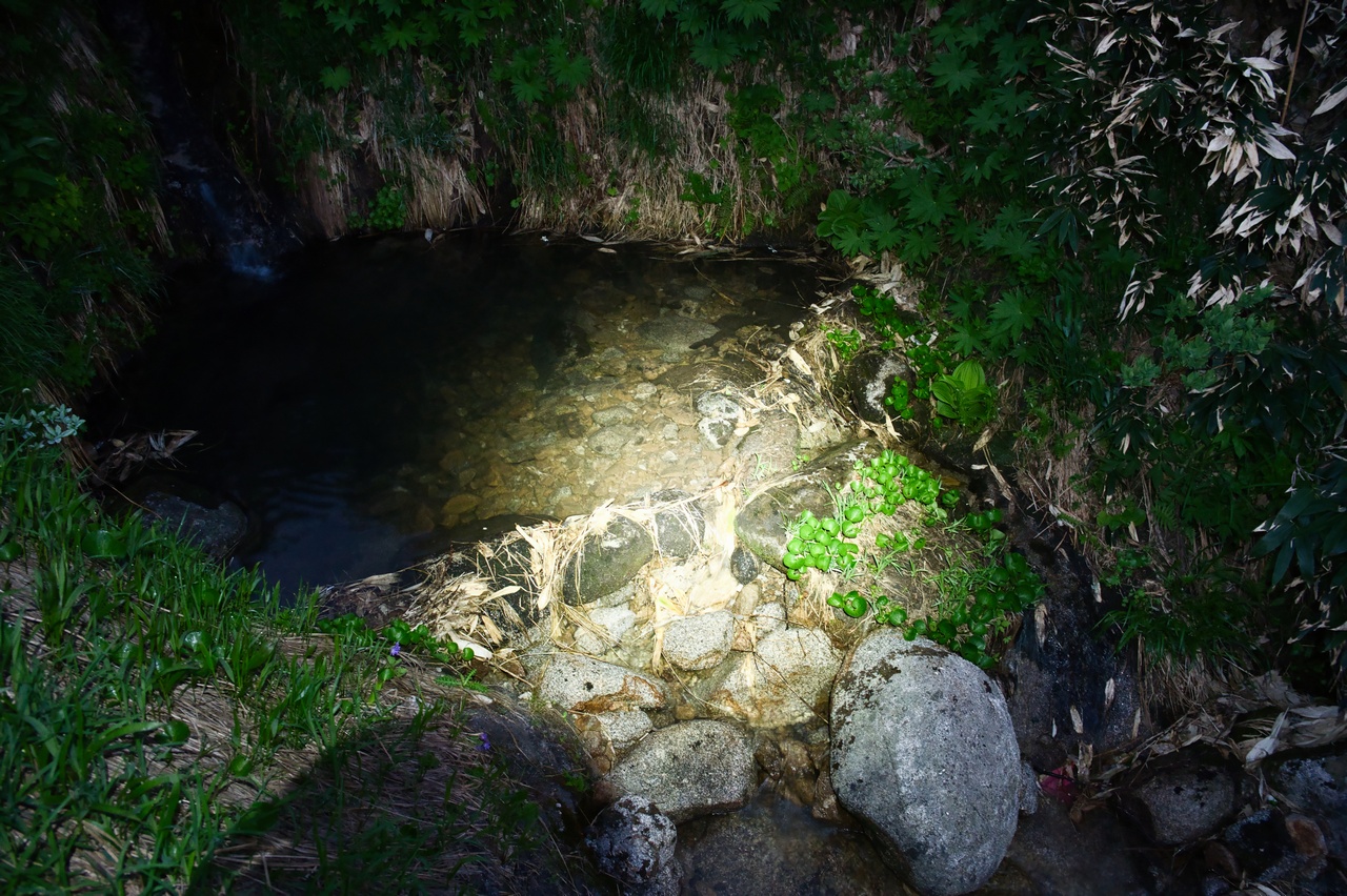 途中に給水可能な水場があります。沢水なので、気になる人は浄水器を使用してください。現時点で既に3Lの水を担いでいますが、ここでさらに2Lを追加して合計5Lにしました。ズシリと重くなった荷物にため息をつきつつ進みます。