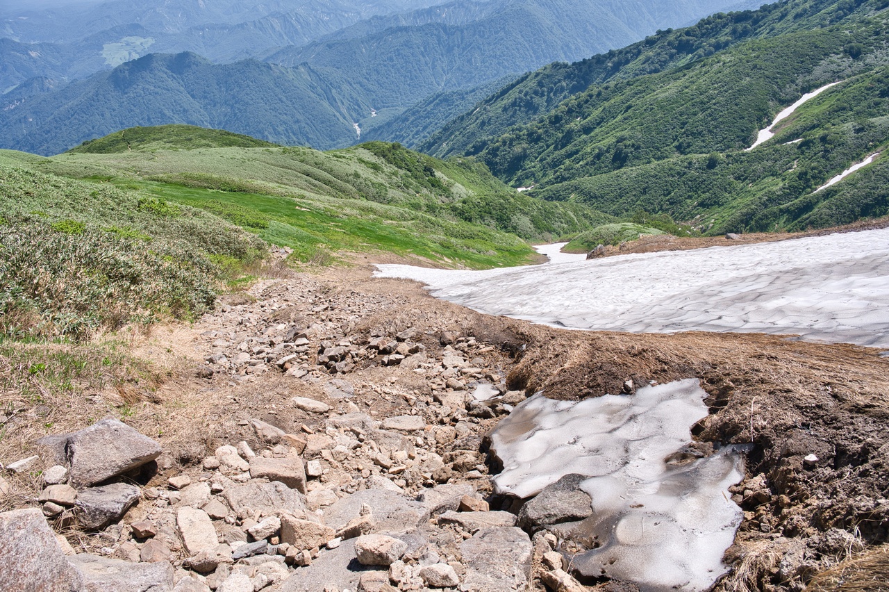稜線の絶景はこれで見納めです。さらば飯豊連峰。願わくばいつかまた、今度こそハクサンイチゲが咲き誇る6月中に訪問したいものです。