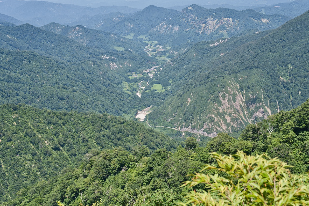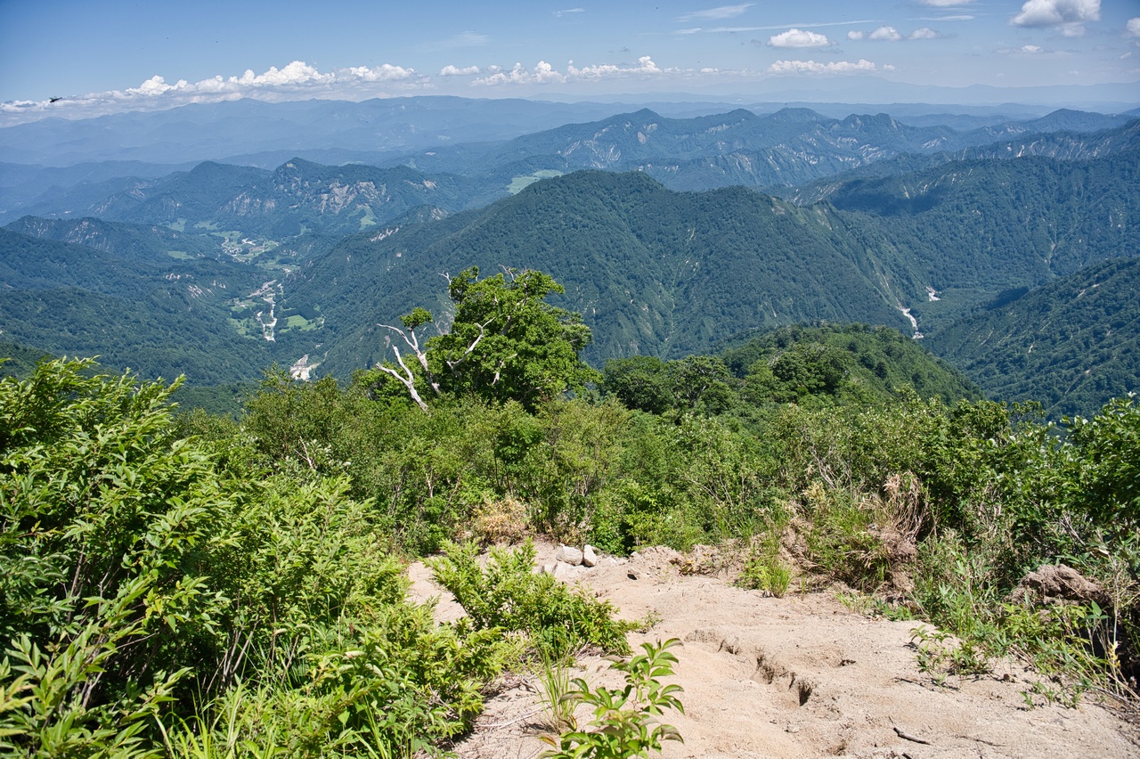 反対方向の北側には、うっすらと朝日連峰の山並みが見えています。飯豊連峰以上に輪をかけて交通アクセス困難な僻地にある山塊です。あちらも夏場は、灼熱地獄になるのでしょうね。