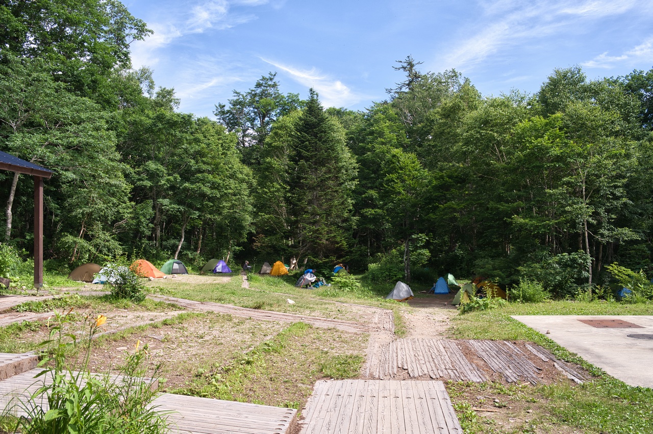 こちらの見晴休憩所の脇がテント場になっています。トイレと水道が完備している他に、なんとWi-Fiまであります。至れり尽くせりではありませんか。