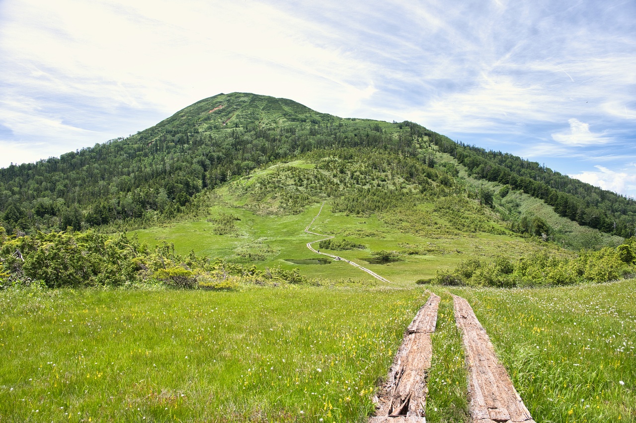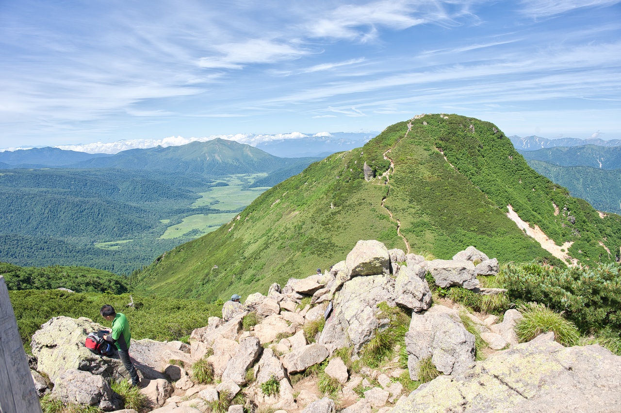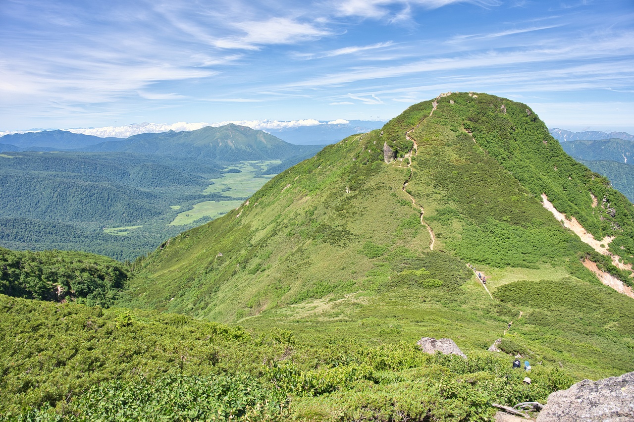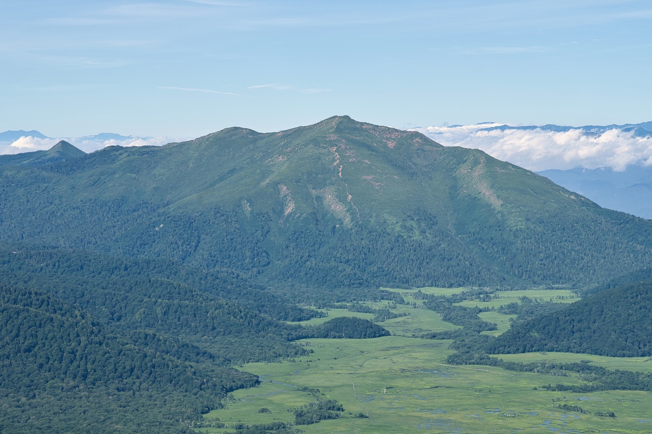 尾瀬ヶ原湿原のすぐ脇に立つ火山です。至仏山と共に尾瀬を象徴する山であり、同時に東北地方の最高峰でもあります。冬には豪雪地帯となることから森林限界高度は低く、山頂の一帯は展望の開けたハイマツ帯となっています。