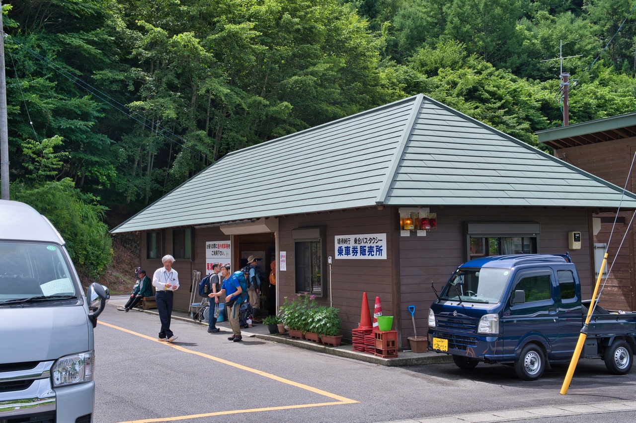 駐車所の脇に券売所の小屋が建っていました。路線バスに乗ってくる人よりも、駐車場に車を停めていわゆるパークアンドライドをする人の方が多数派だから、わざわざ場所を変えたのでしょうかね。