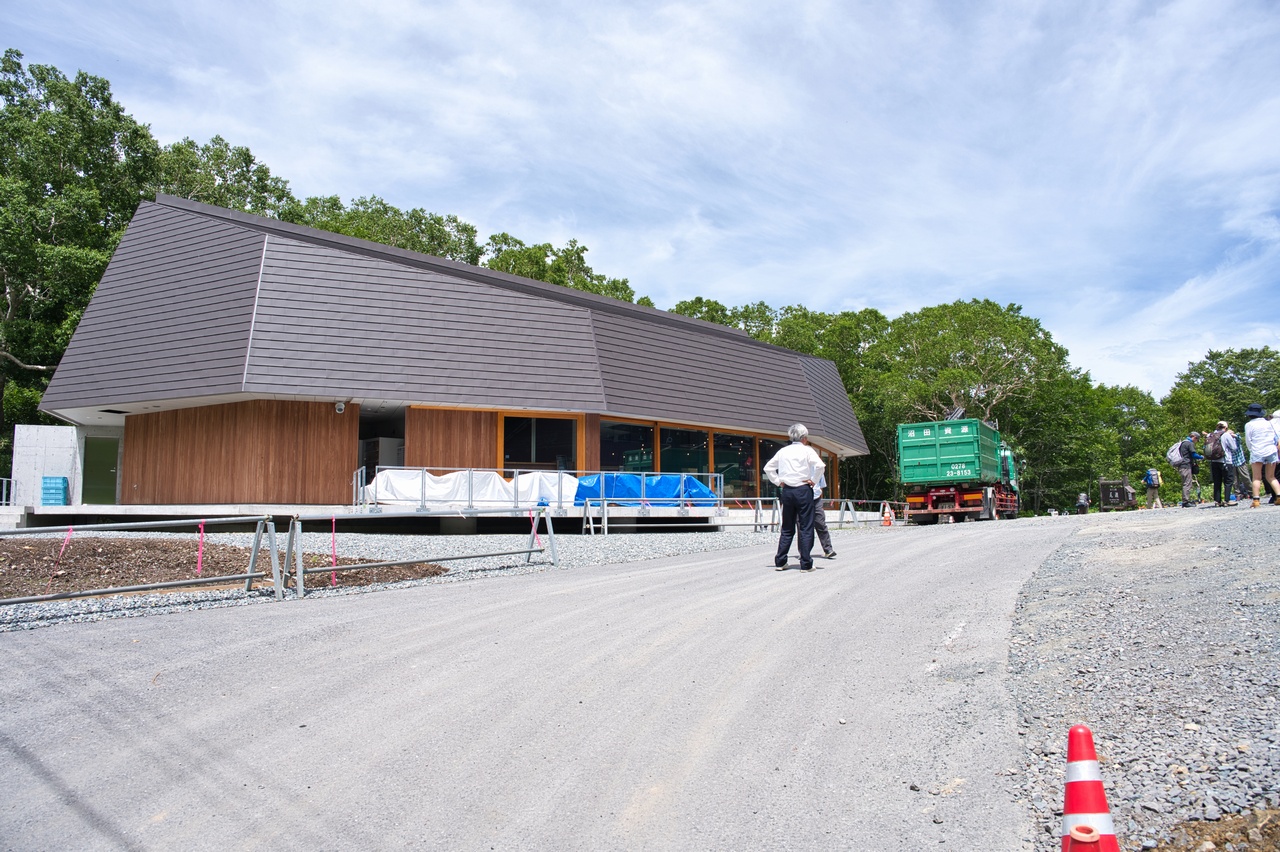 鳩待峠に到着しました。峠に立つこちらの鳩待峠休憩所は、老朽化に伴い建て替え工事が進められします。先ほどのヘリは、その建築資材を運搬していたものでした。