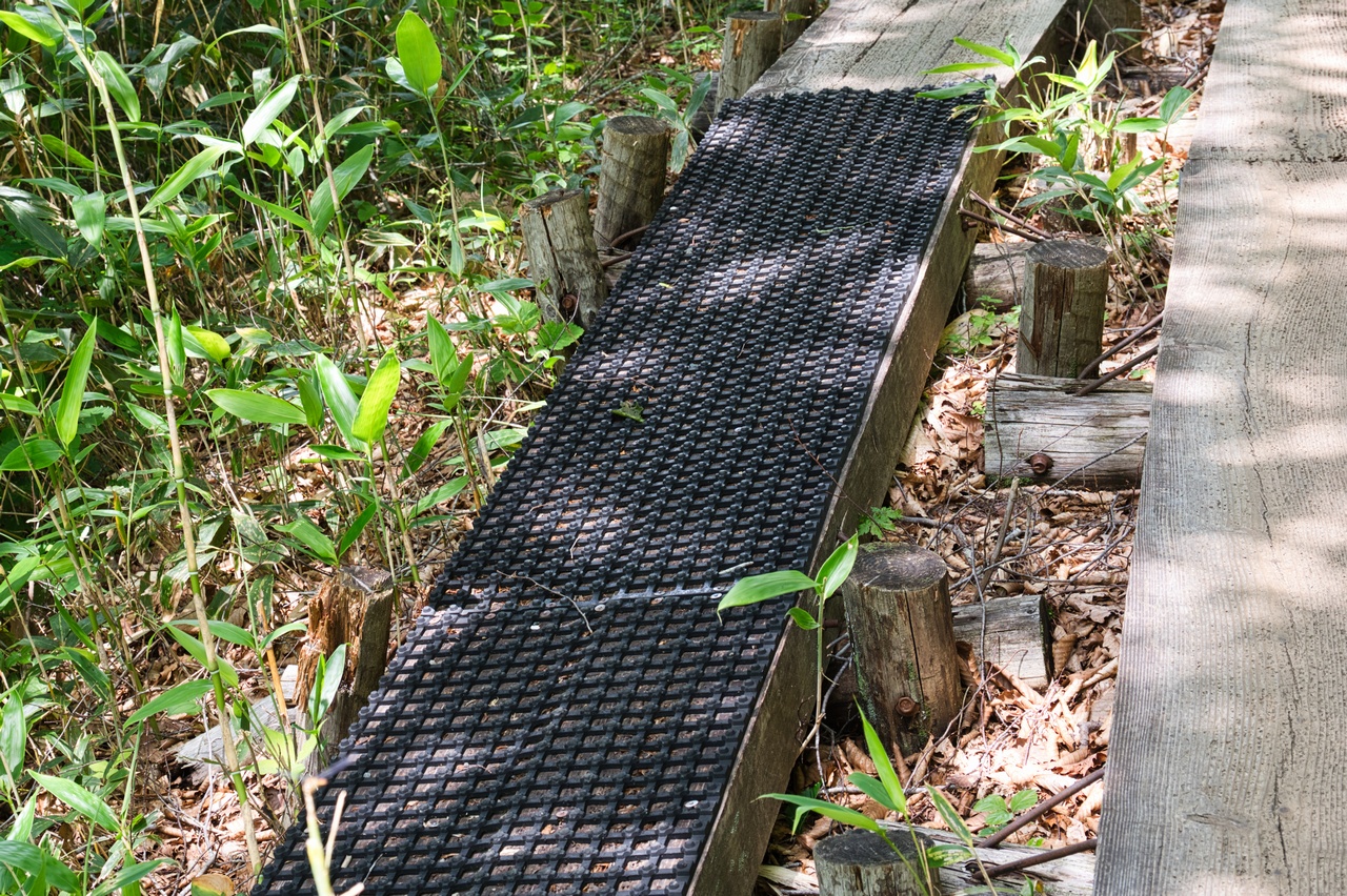 尾瀬と言われて真っ先に脳裏に浮かぶのは、濡れている時に異常なまでに滑る木道です。その木道に、スリップ防止のための網目状のゴムが貼り付けられていました。なんだ、それが出来るのだったら、初めからそうしてくださいよ。