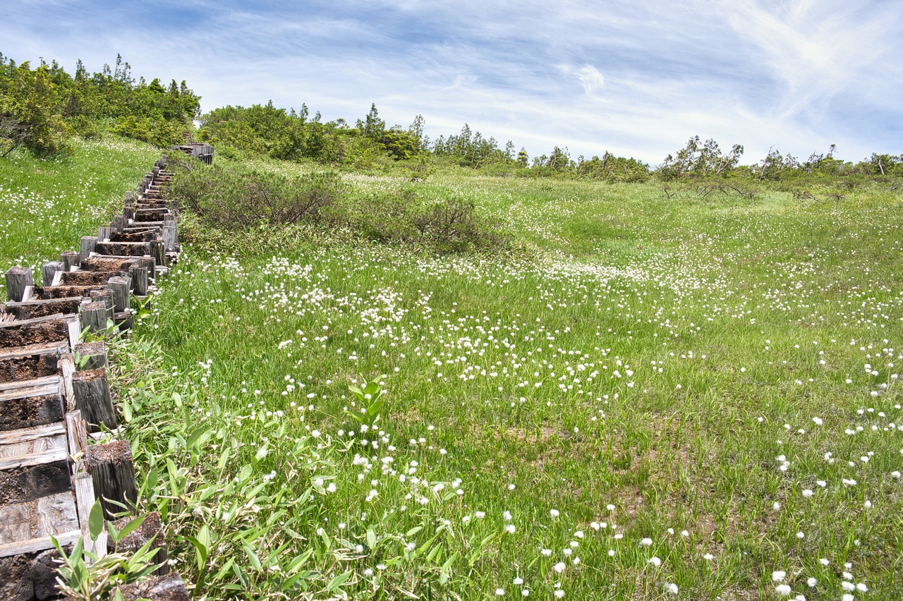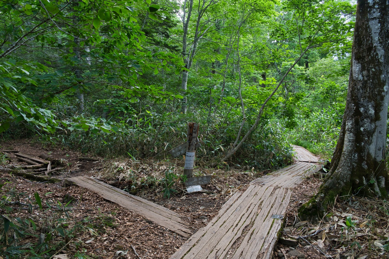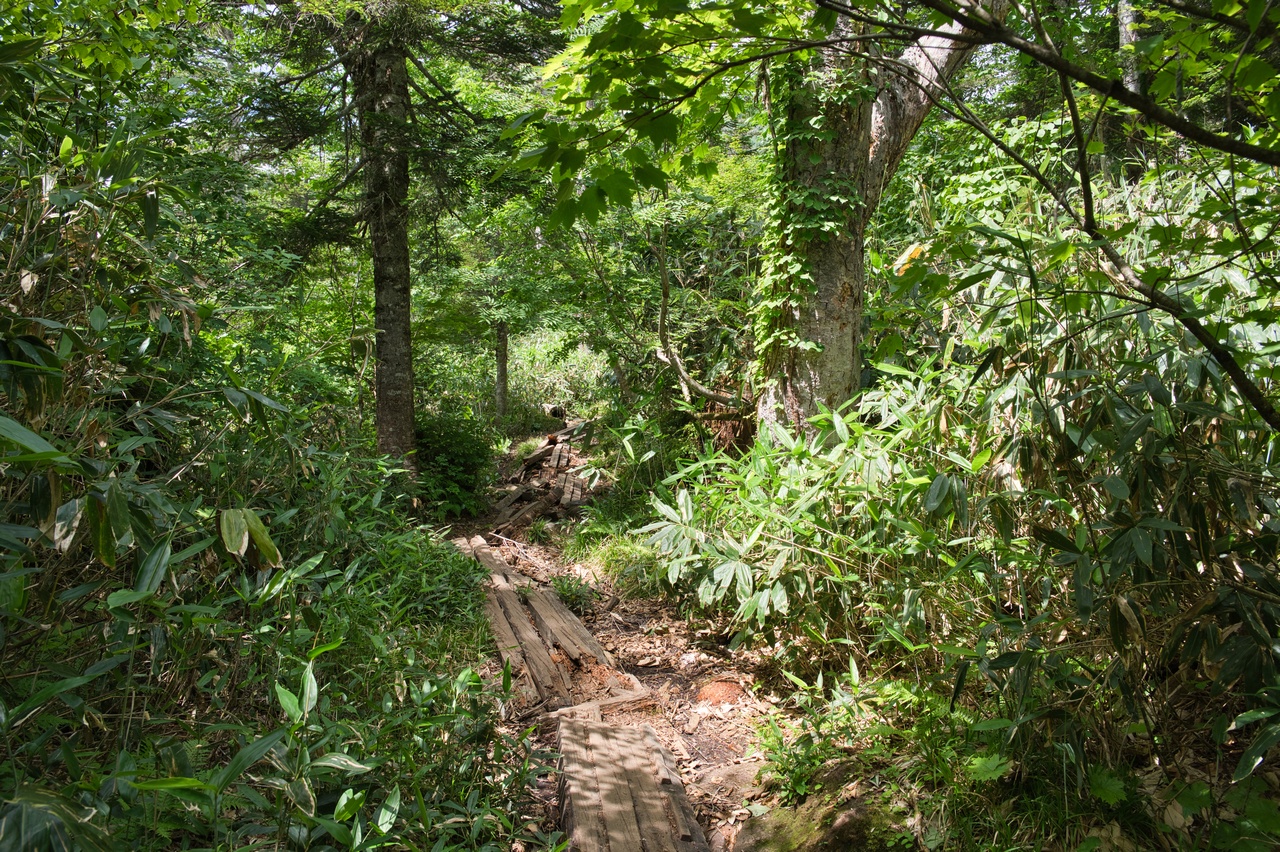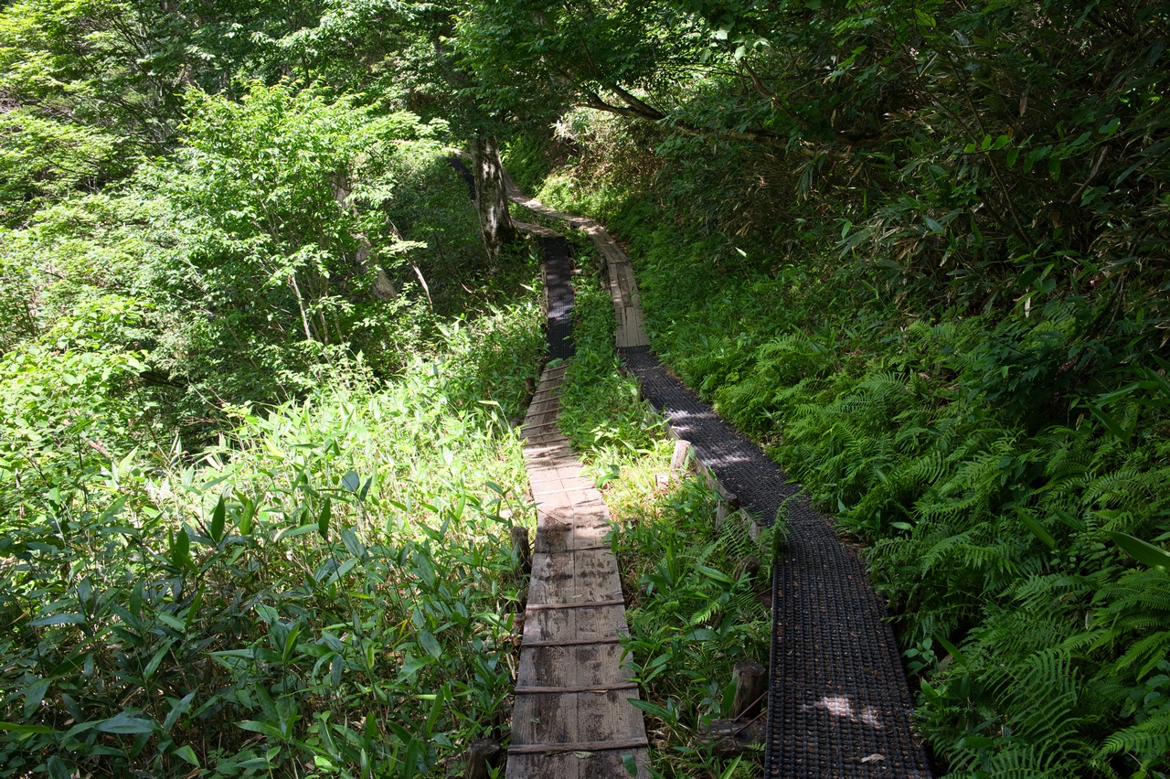 ここでも木道の老朽化が著しく、すでに朽ちて土に還りつつありました。こうした木道の老朽化問題は、東北地方の山では頻繁に目にします。現状を見るに、登山者から入山料を取る方向へ舵を切らざるおえないのでしょうか。
