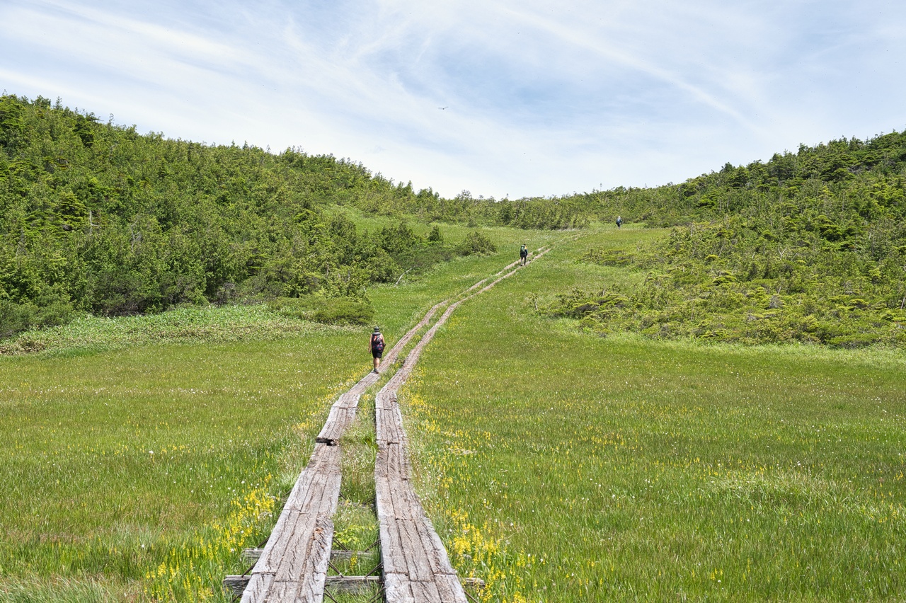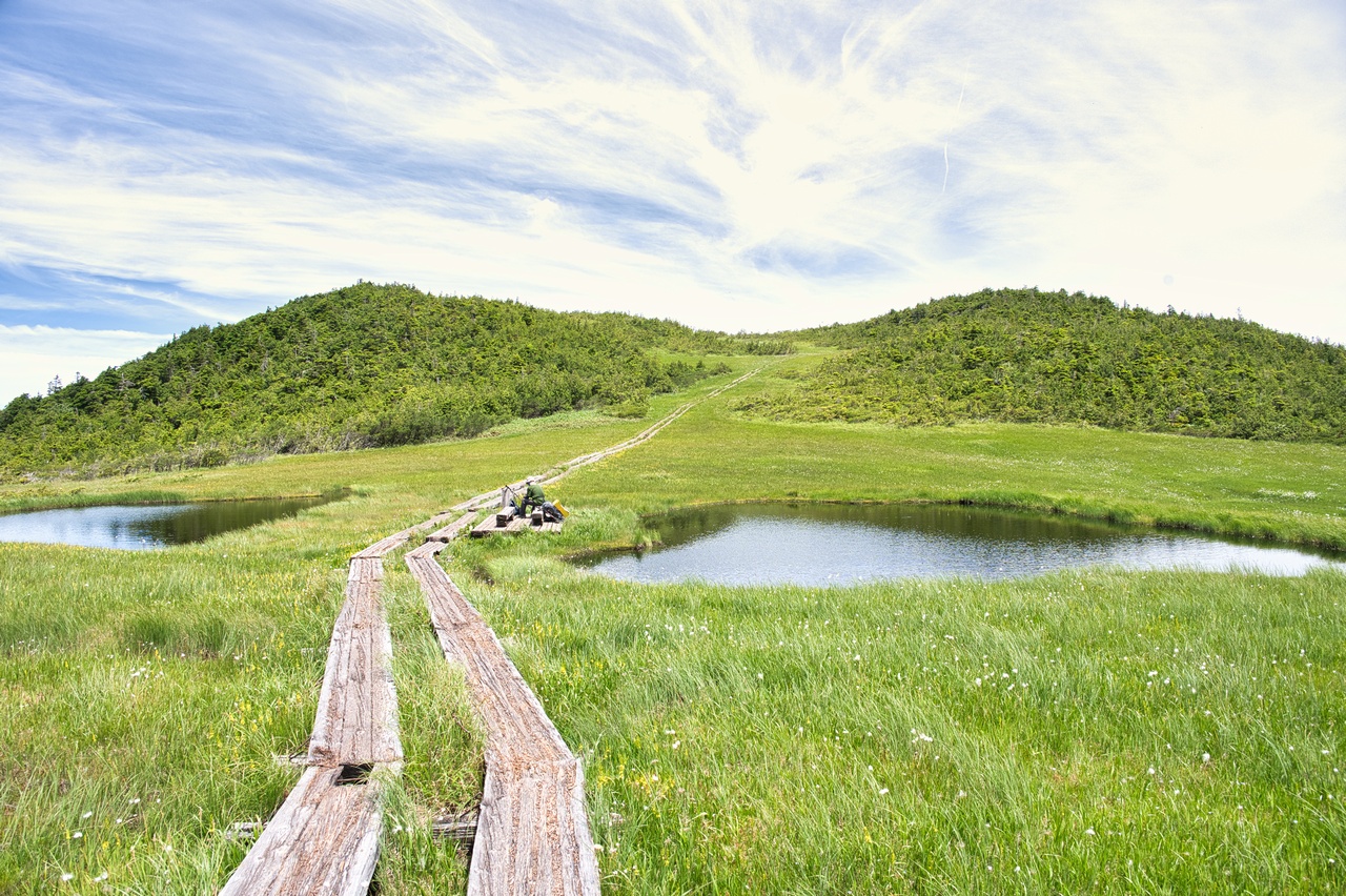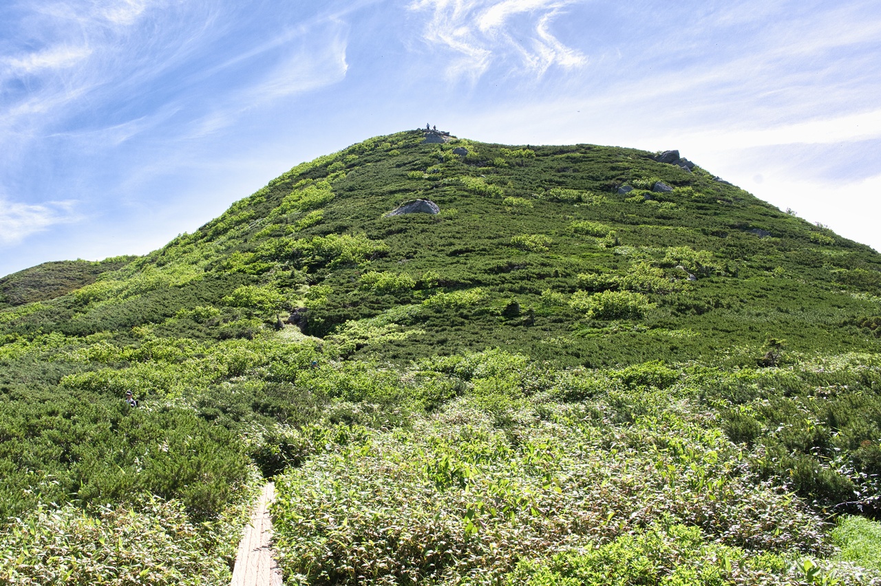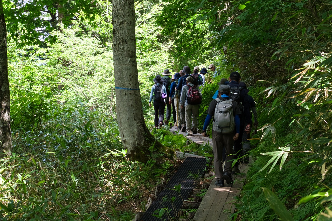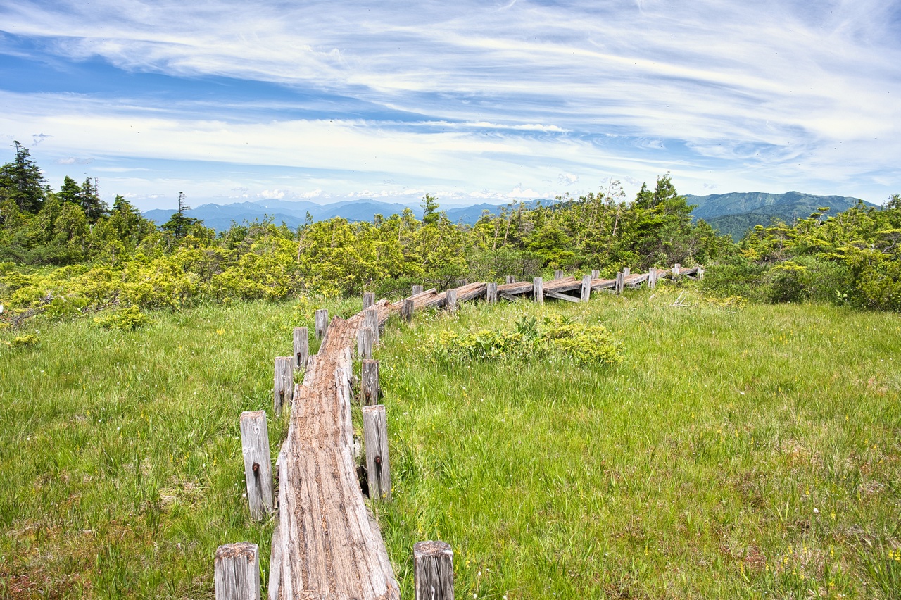 ここでも木道の老朽化が著しく、すでに朽ちて土に還りつつありました。こうした木道の老朽化問題は、東北地方の山では頻繁に目にします。現状を見るに、登山者から入山料を取る方向へ舵を切らざるおえないのでしょうか。