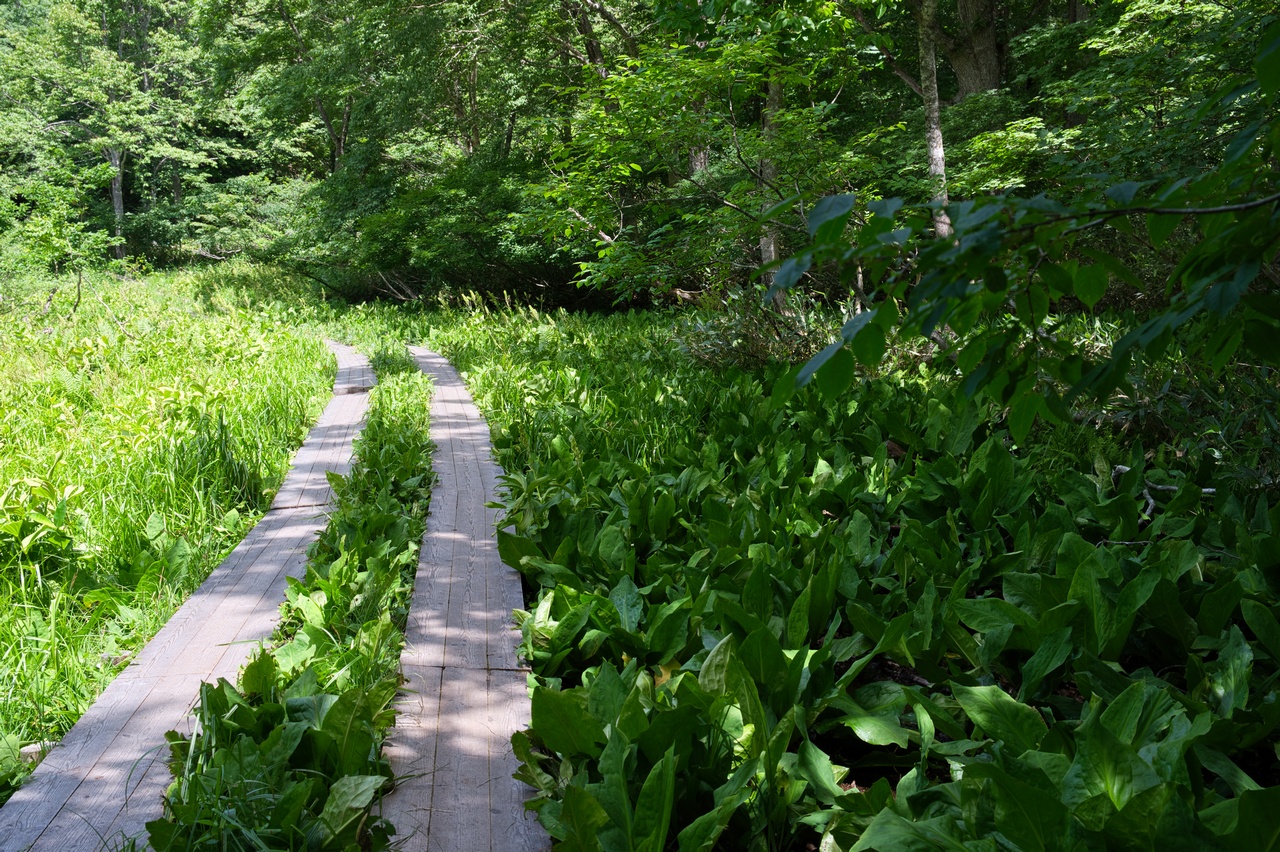 この下ってゆく最中に水芭蕉の群生地があるのですが、今はもうシーズンではないため1輪も咲いてはいません。水芭蕉が咲くのは雪解け直後の、5月の中旬から下旬頃にかけてです。