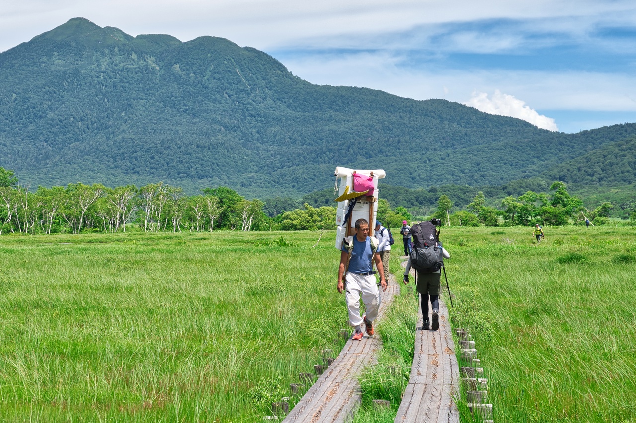 尾瀬名物の歩荷(ボッカ)さんが歩いています。なんでも100キロくらいの荷物を背負うのだとか。そんなに背負ったら、そもそも立ち上がれる気がしません。