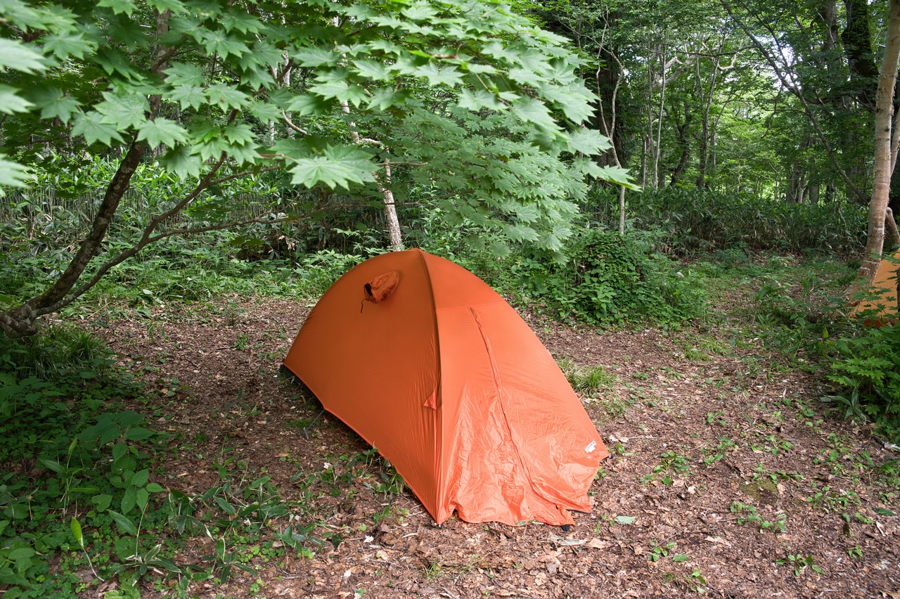 憩いの我が家を手早く設営します。風の影響がまったくない森の中なので、張り綱すら結んだままで適当なものです。