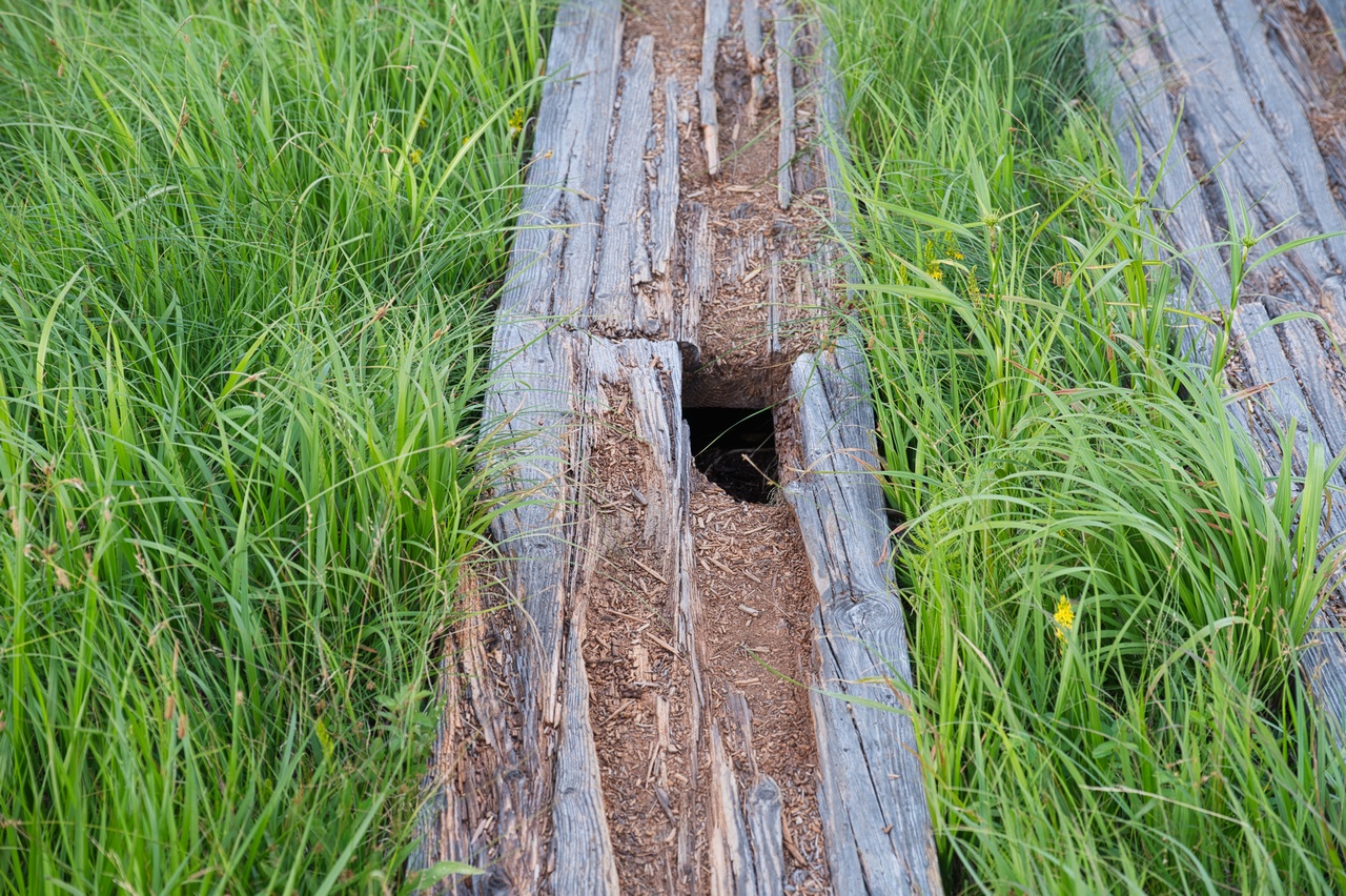 尾瀬ヶ原湿原の中でも、福島県側の木道は老朽化が著しく、穴だらけでガタガタな状態です。福島県側の土地は東電ではなく国有地となっており、木道を管理している環境省の予算不足のためこのような状態になってしまっているのだとか。