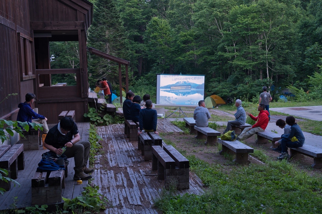 スライドショーが終わる頃には、辺りはすっかりと暗くなっていました。翌日の登山に備えて、この後は早々とシュラフに潜り込みました。お休みなさい。