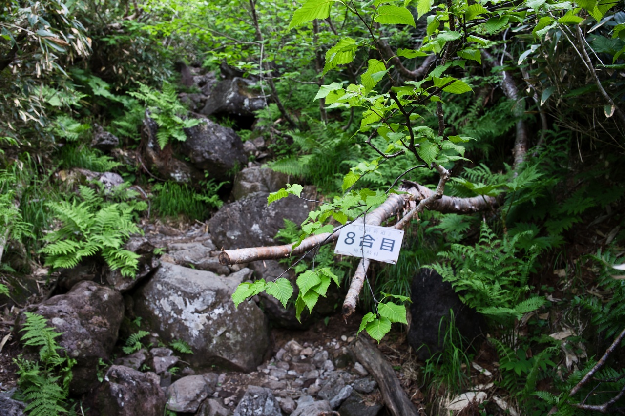 8合目までやってきました。ここから先は森林限界を超えて、周囲の展望が開けます。しかしそれは同時に、この先は直射日光にさらされて暑さに苦しむことになることを意味しています。