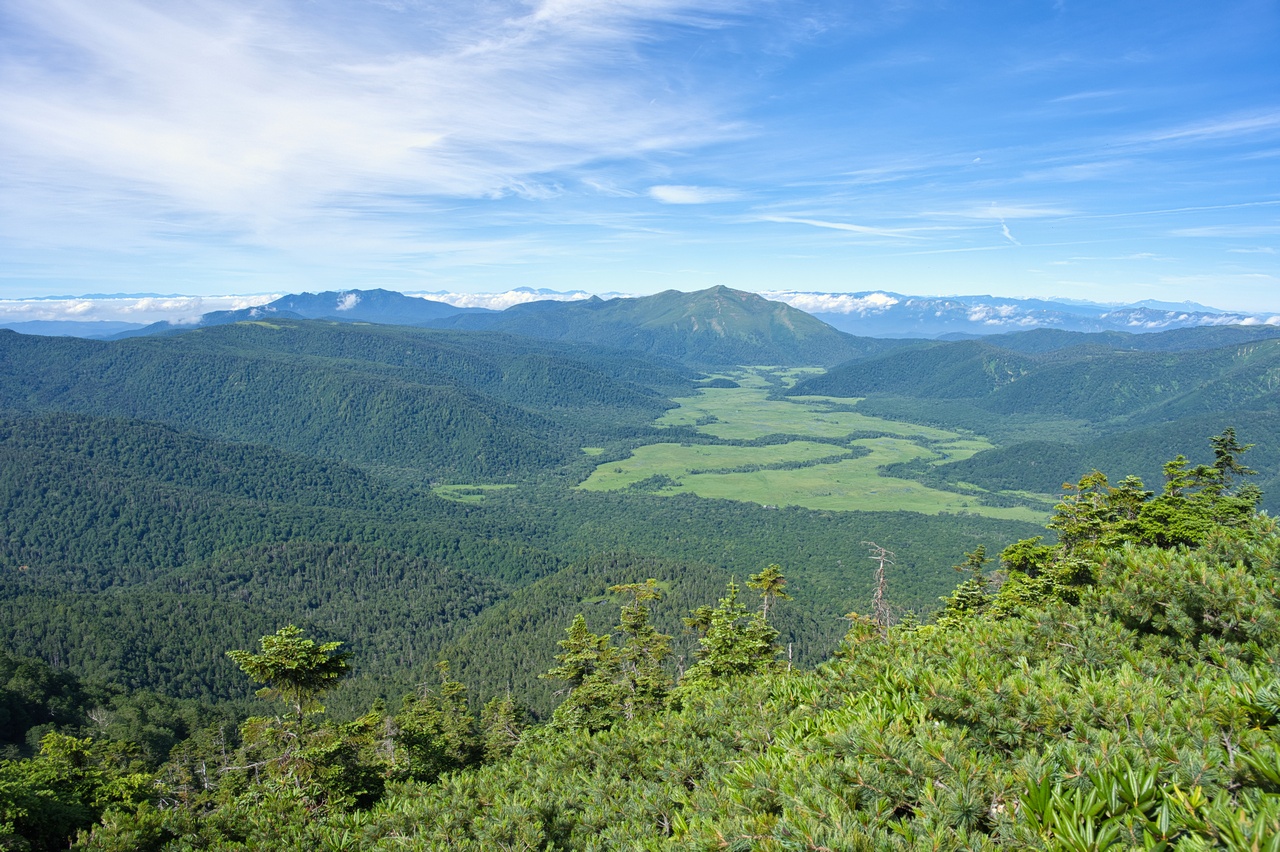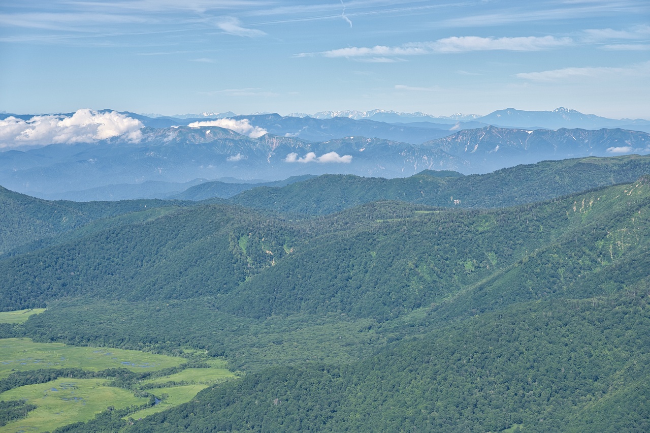 山頂からは360度ほぼ全方位に展望が開けています。さっそく見て行きましょう。西側には尾瀬ヶ原湿原が広がり、その背後には至仏山や上州武尊山(2,158m)などの姿があります。