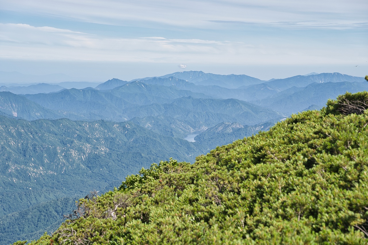 さらに視線を右へ動かすと、只見湖周辺に連なる守門岳(1,537m)や浅草岳(1,586m)などが視界に入ります。秘境を称する山域はそれこそ全国各地に存在していますが、その中でもこの奥只見エリアの秘境ぶりは、頭ひとつ抜けています。