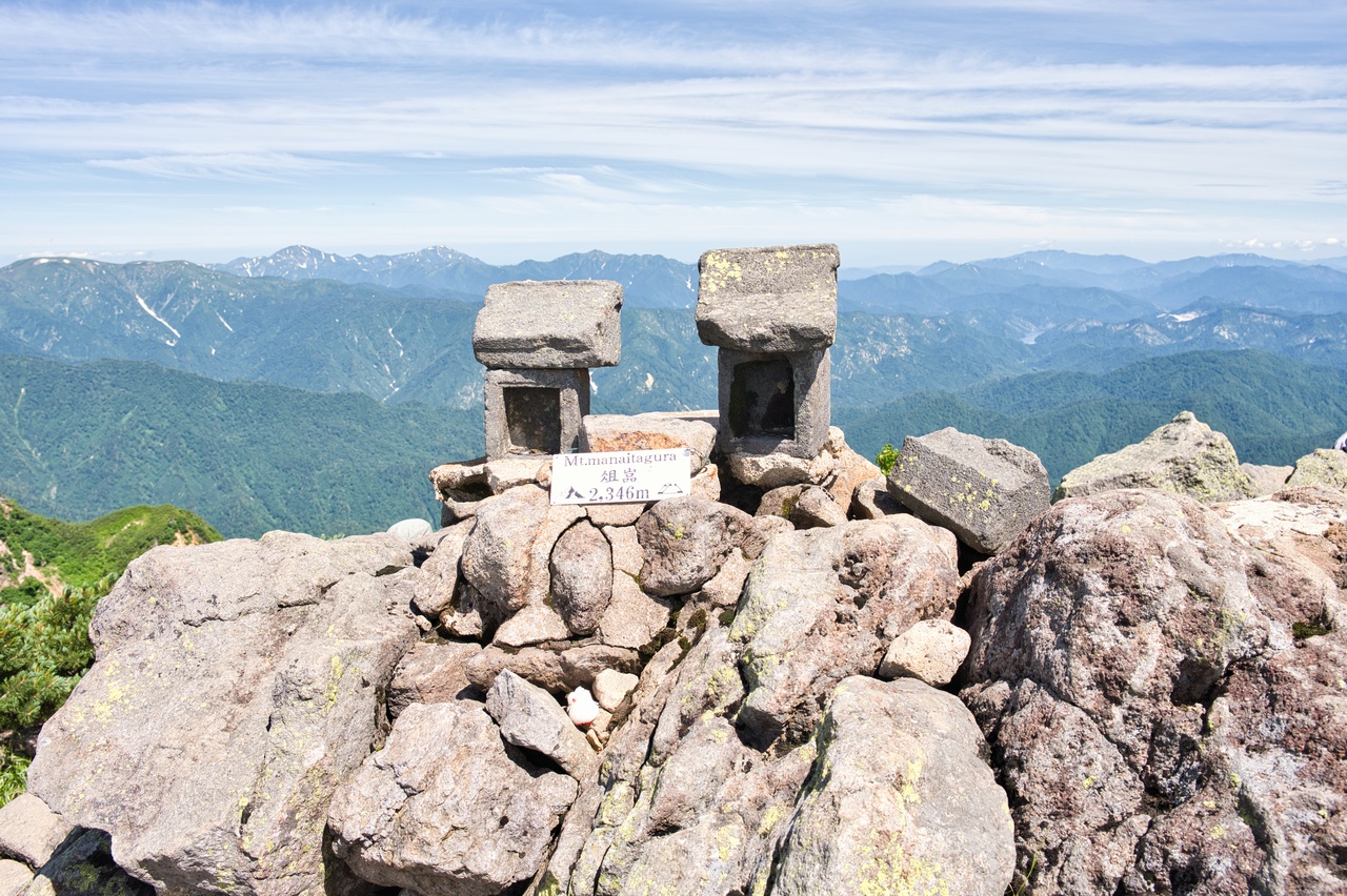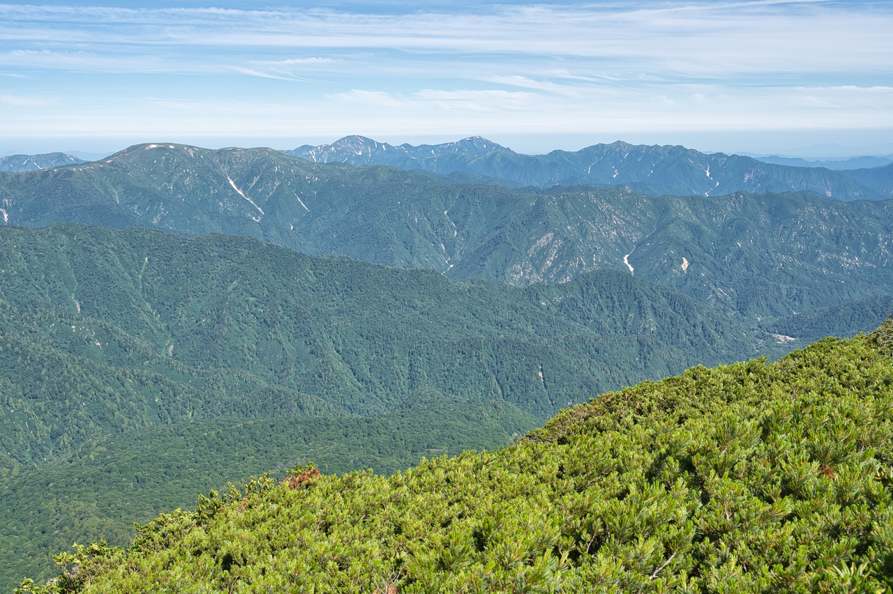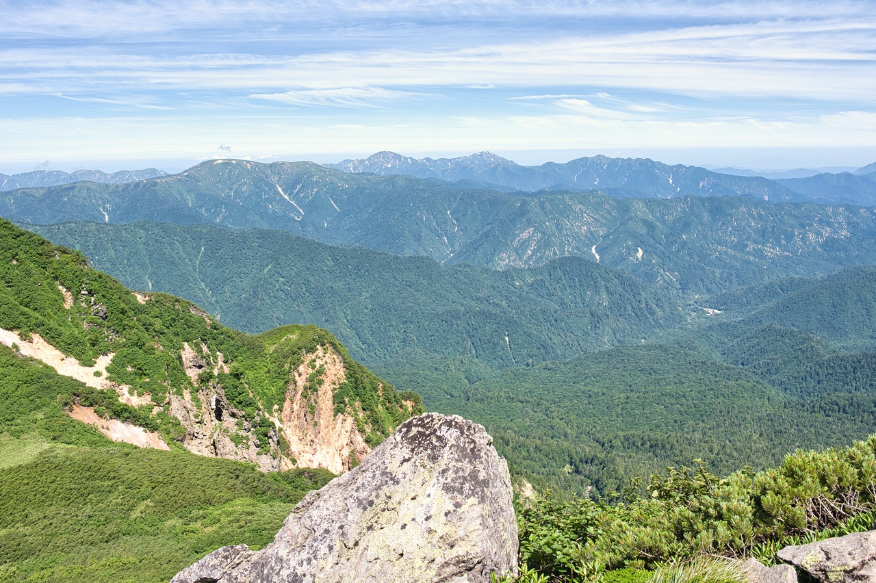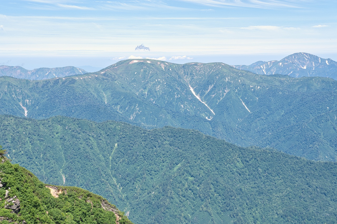 少し視線を右に動かして北西方向の展望です。苗場山(2,145m)の背後に後立山連峰や頚城山塊の山々が見えています。