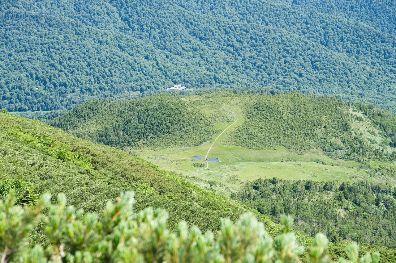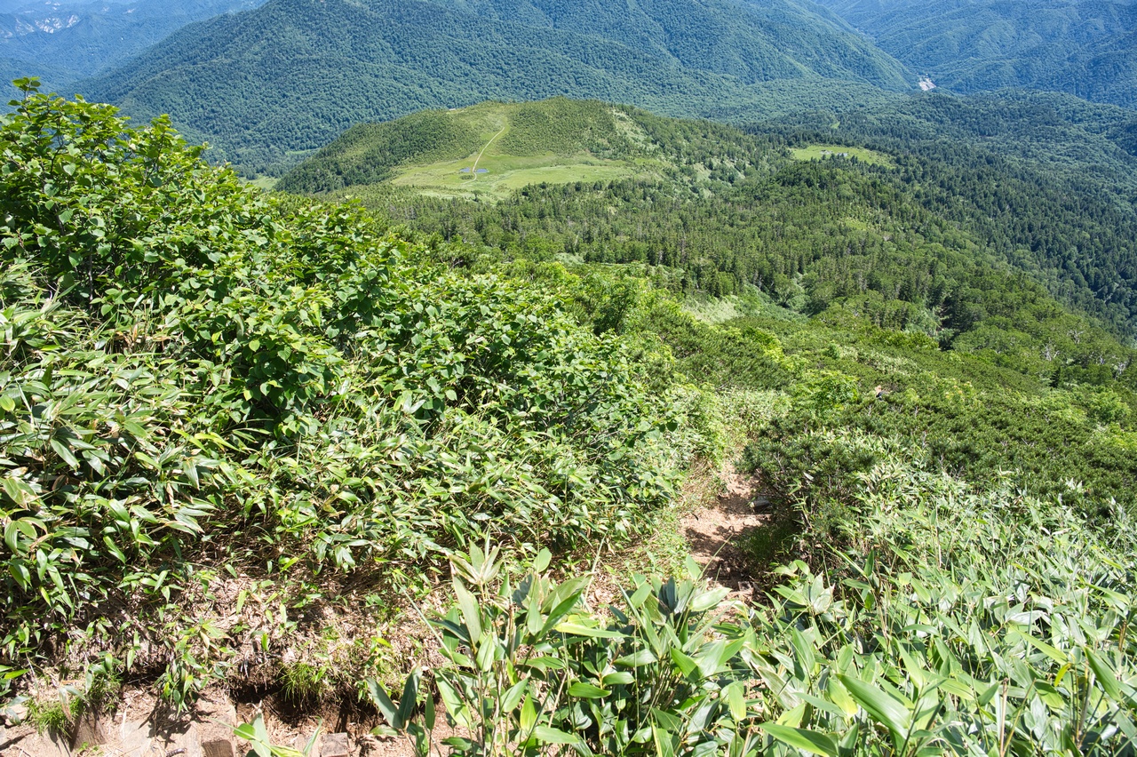 眼下の尾根上に、田代(たしろ)と呼ばれる小湿原が広がっているのが見えています。下山の途中で、あの湿原の中を通って行きます。ワタスゲがそれはもうたくさん咲いているとのことなので、とても楽しみです