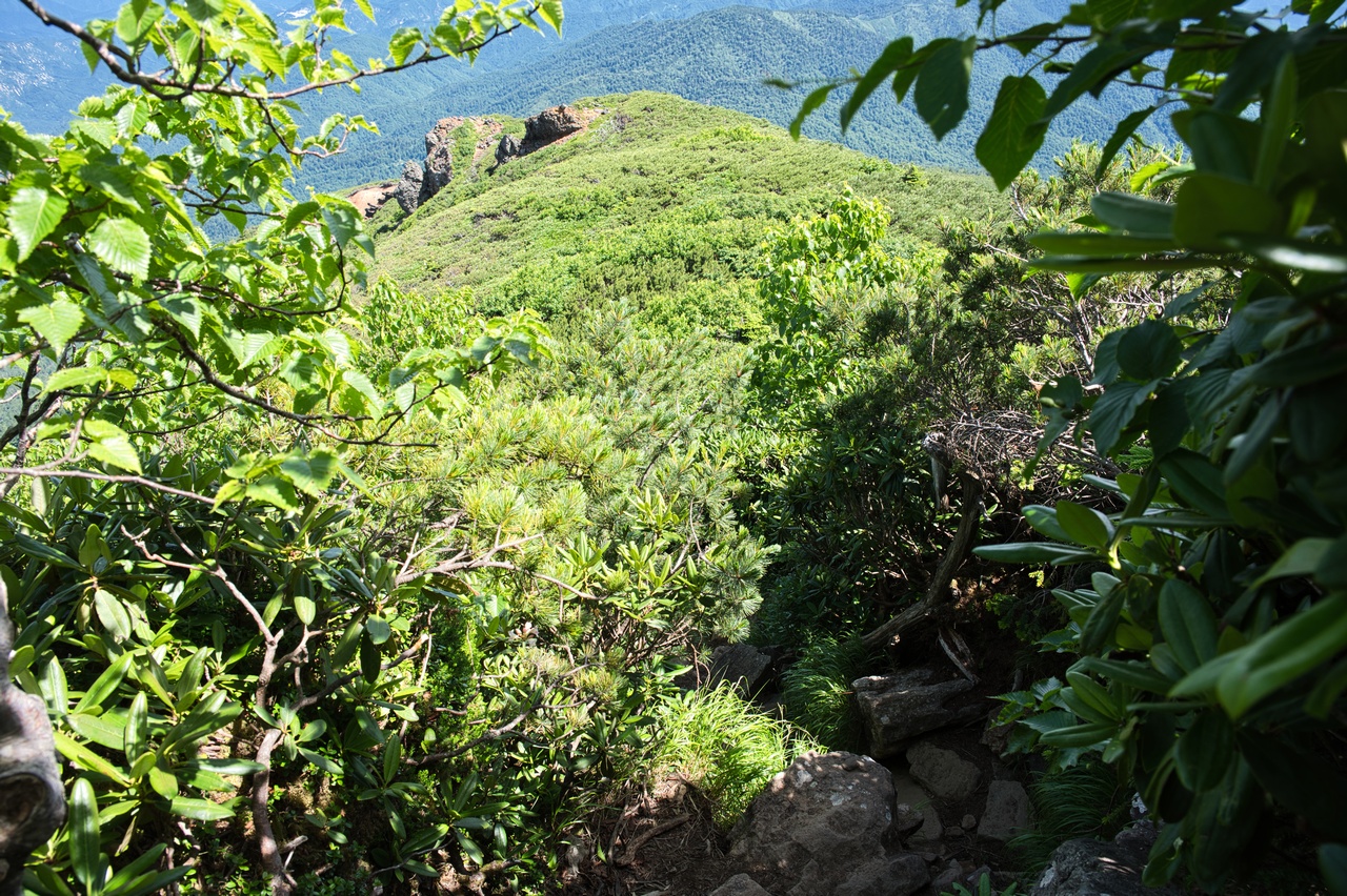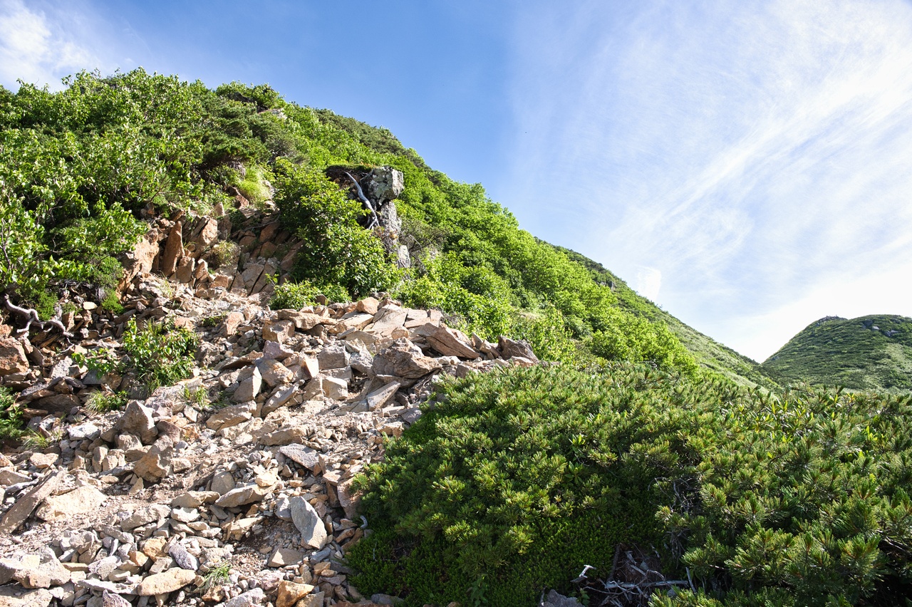 下り始めて早々に、ハイマツとシャクナゲの藪の中に突入しました。この道は本当に大丈夫なのかと前途に一抹の不安を覚えましたが、幸いにも藪になっているのは山頂の周辺だけでした。