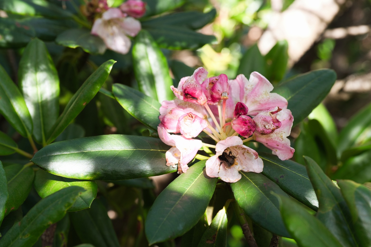 ほぼ終わりかけですが、シャクナゲがまだ咲いていました。気候的に過酷な環境だからなのか、東北地方の山に咲くハクサンシャクナゲは、奥秩父の山などでよく目にするアズマシャクナゲに比べると、花そのものがずっと小ぶりです。