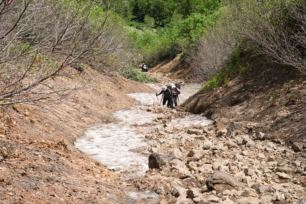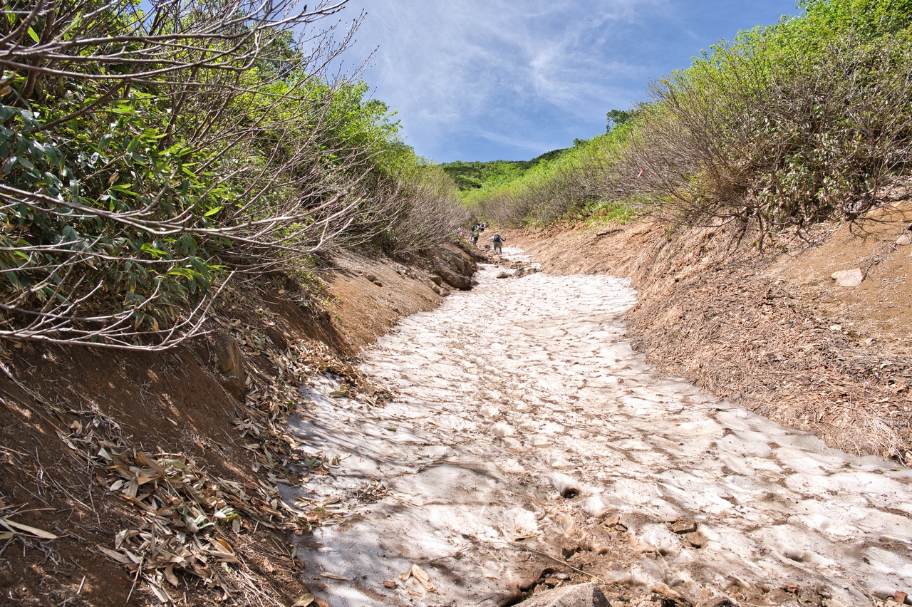 小さな谷になっている個所に、まだ雪渓が残っていました。今回軽アイゼンは用意してきていなかったので、これには少し狼狽えました。