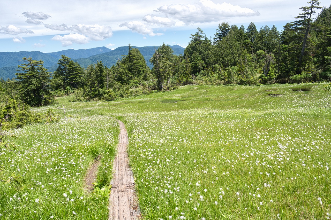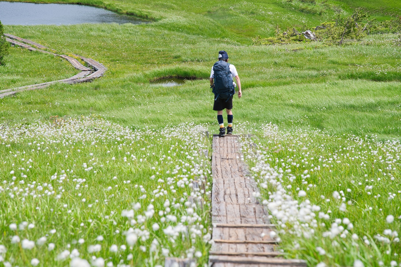 登り返しの最中にもワタスゲロードが続きます。凄いという評判は前々から聞いてはいたのですが、期待していた以上の光景が広がっていました。