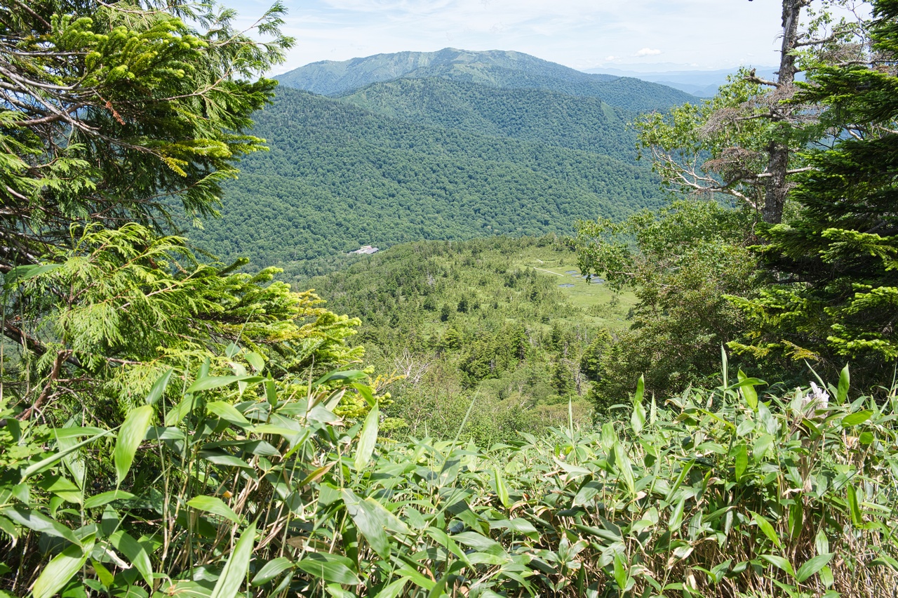 樹木の間から尾瀬ヶ原湿原が見えました。淡々と登り続けたことにより、だいぶ標高の高い位置にまで登ってきました。