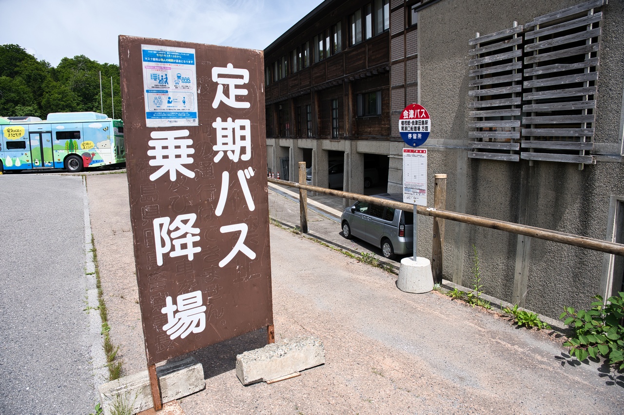 会津鉄道の会津田島駅から路線バスが出ています。帰路のバスは1日に3本のみで、次のバスは15時30分発です。だいぶ待ち時間があります。