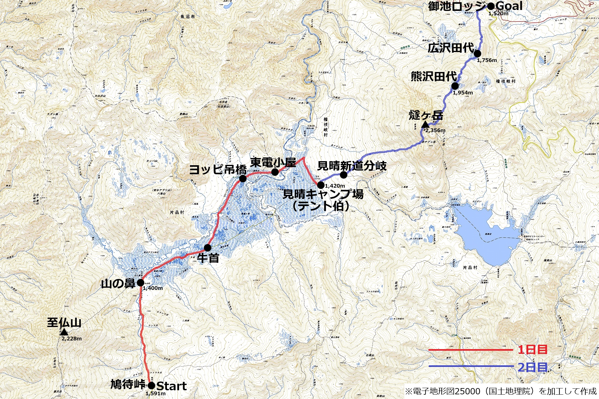 2日目は見晴らし新道を登り燧ヶ岳へ。下山はもと来た道を戻らずに、桧枝岐村の御池ロッジ方面へと下ります。公共交通機関利用の強みを生かした、尾瀬を横断する工程です。