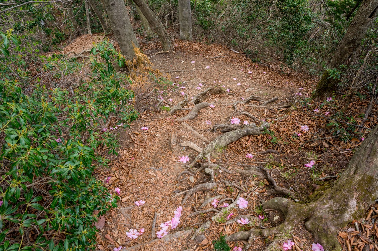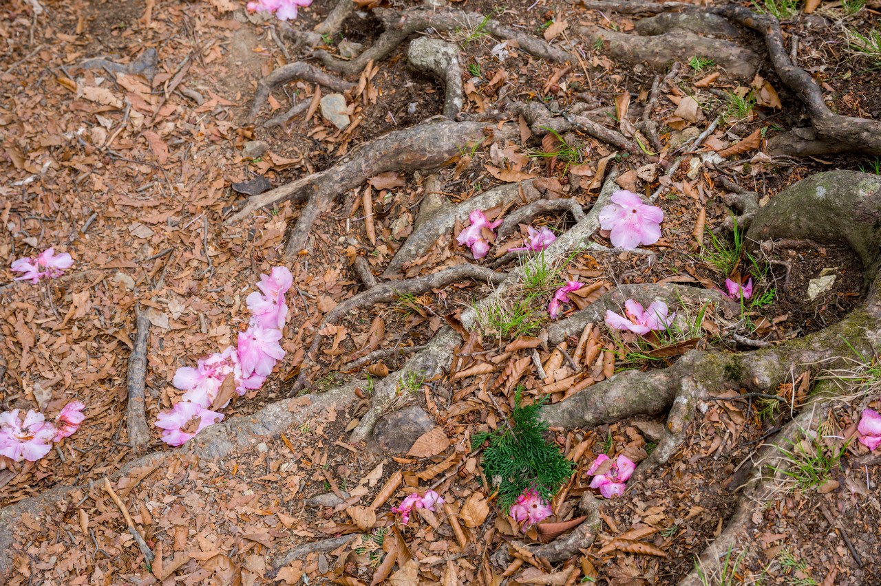 アカヤシオに期待して訪問した山で待っていたのは、すでに地面の上に散らばってしまっている花びらでした。