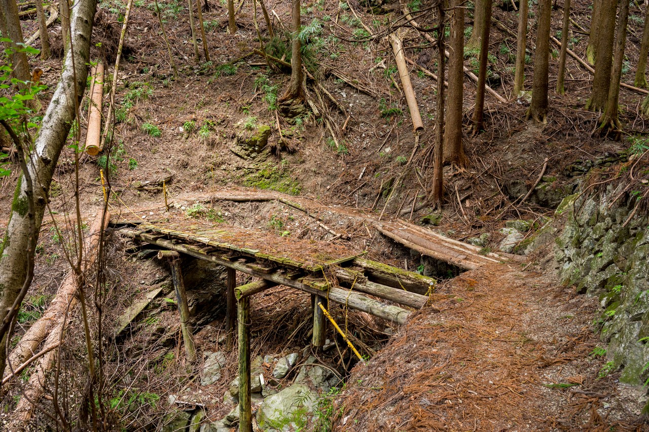 鉱山があった時代のものと思われる古びた木橋が、朽ちて自然に還りつつありました。代わりの丸太橋がちゃんと架かっているので、通行には支障ありません。
