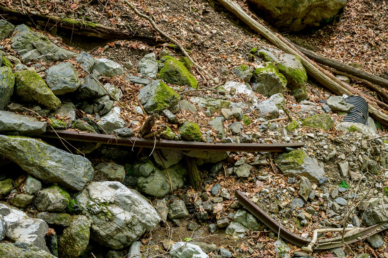 かつては集落の少し先まで、鉱石を搬出するための軌道が存在していました。今でもこうしてレールの残骸が残っていました。