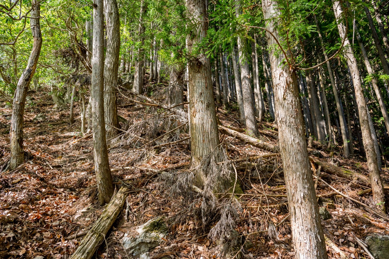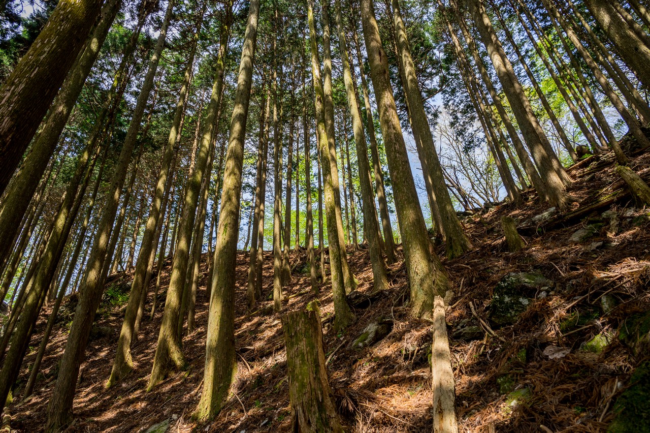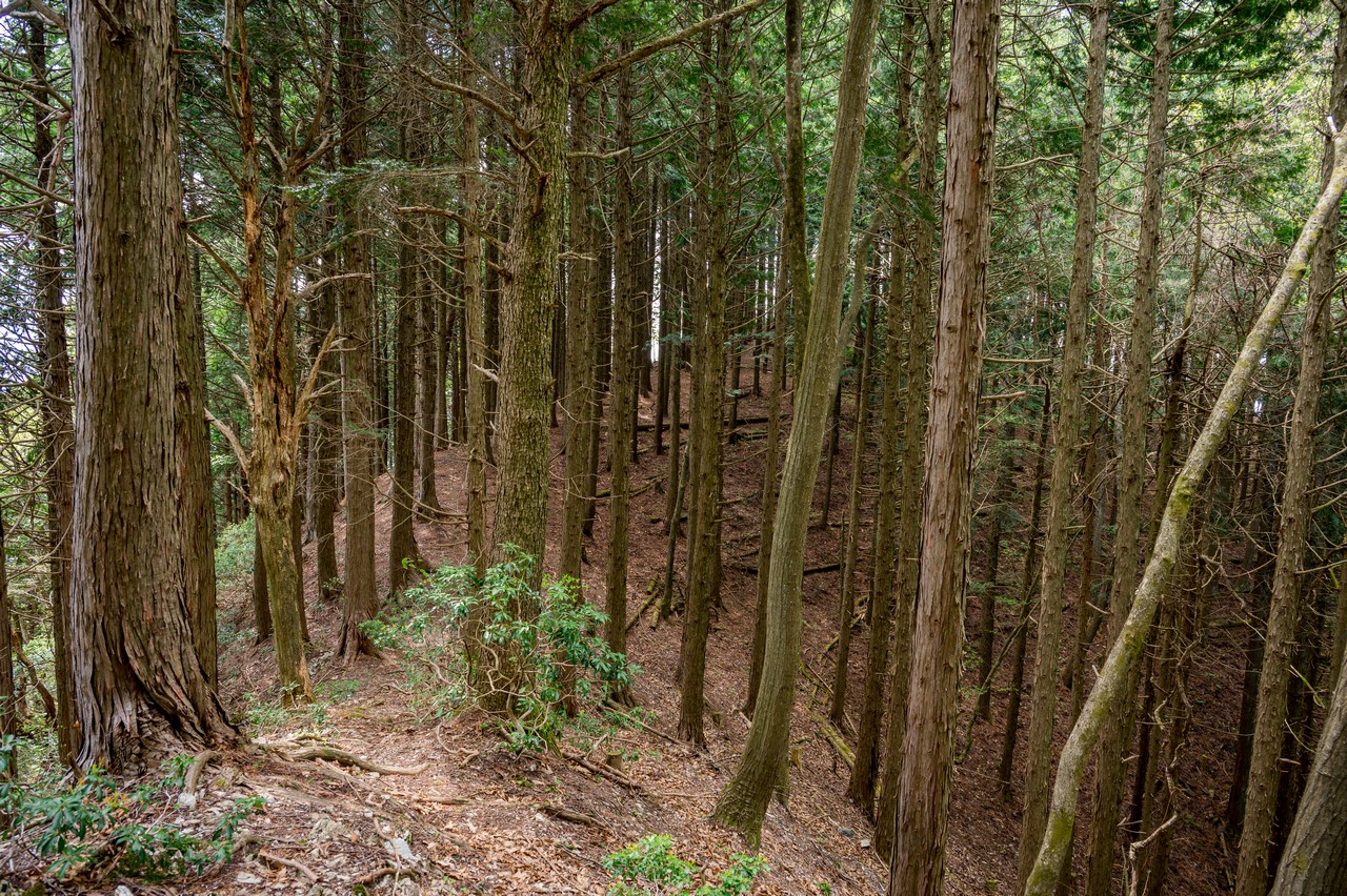 尾根の上が広葉樹の自然林と杉の植林の境界になっています。奥多摩や奥武蔵ではよく見られる光景で、日当たりの良い南東側の斜面だけが杉林化されています。