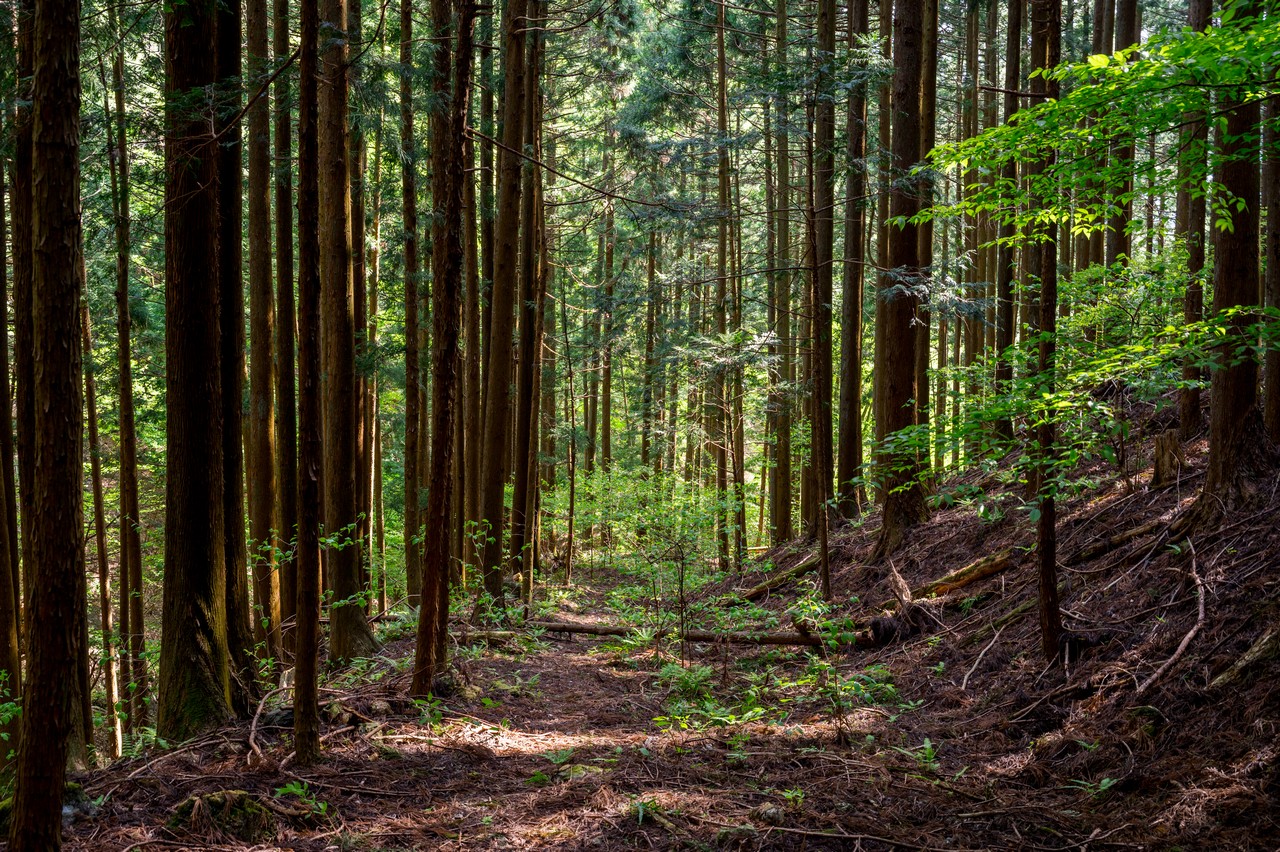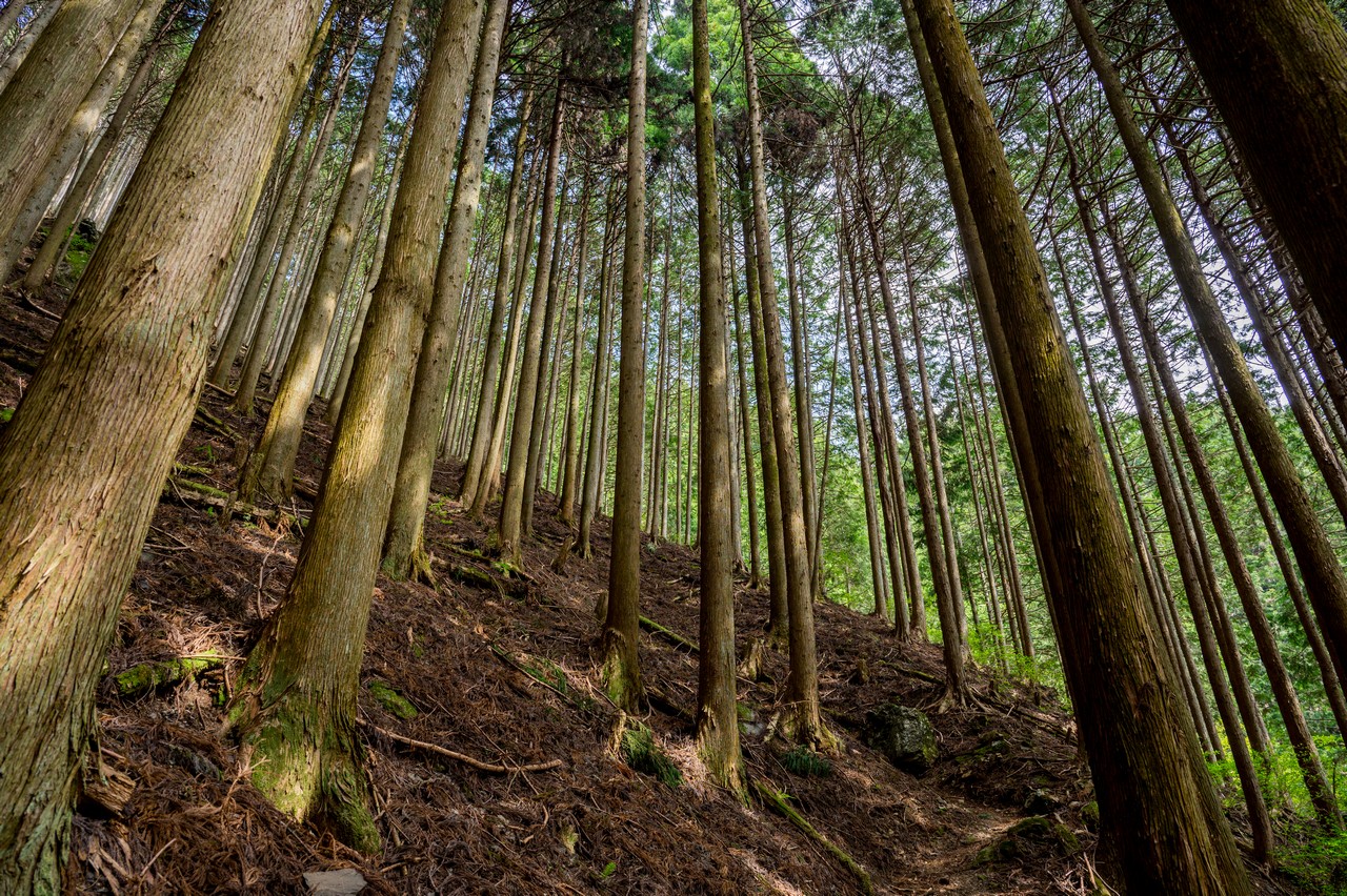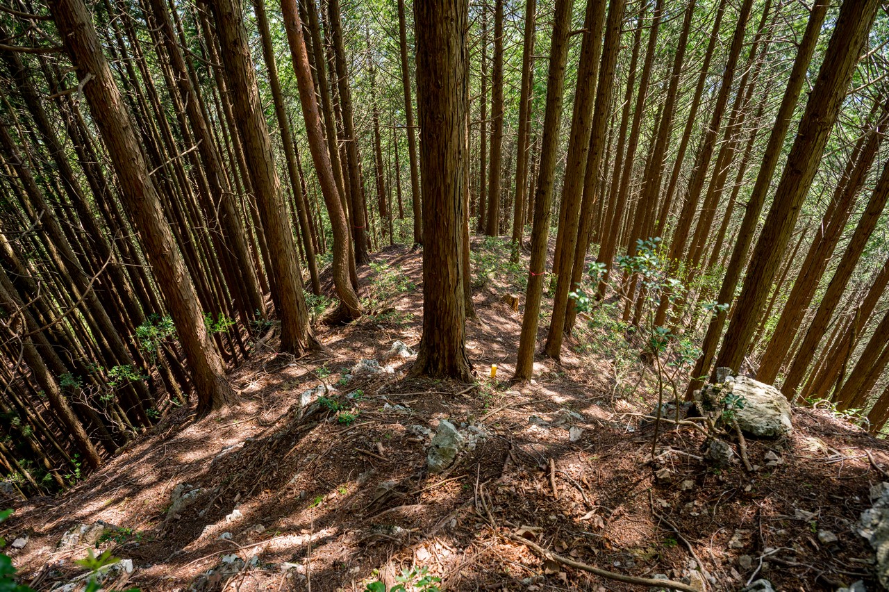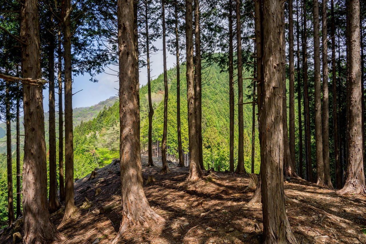 尾根の上が広葉樹の自然林と杉の植林の境界になっています。奥多摩や奥武蔵ではよく見られる光景で、日当たりの良い南東側の斜面だけが杉林化されています。