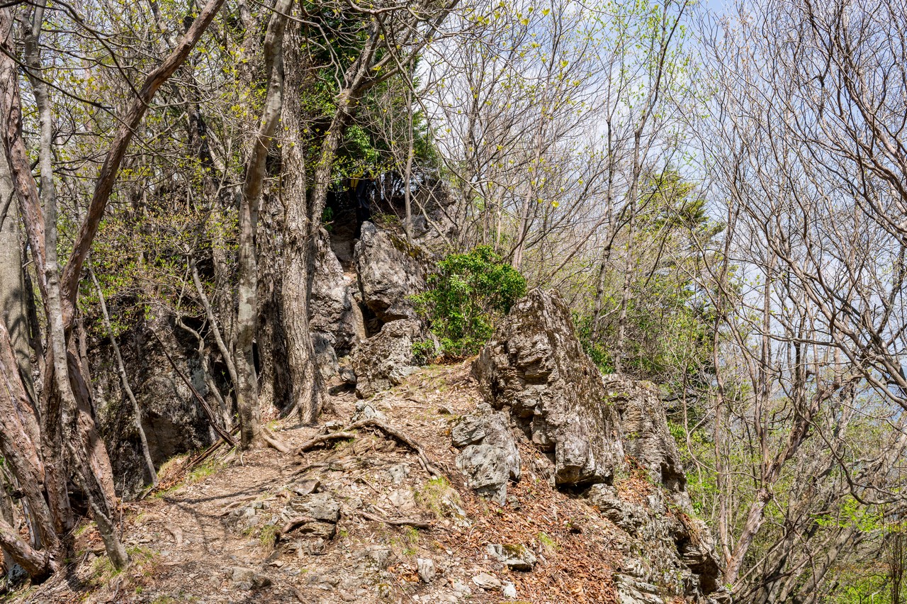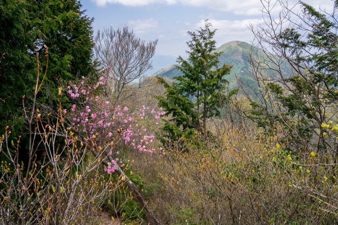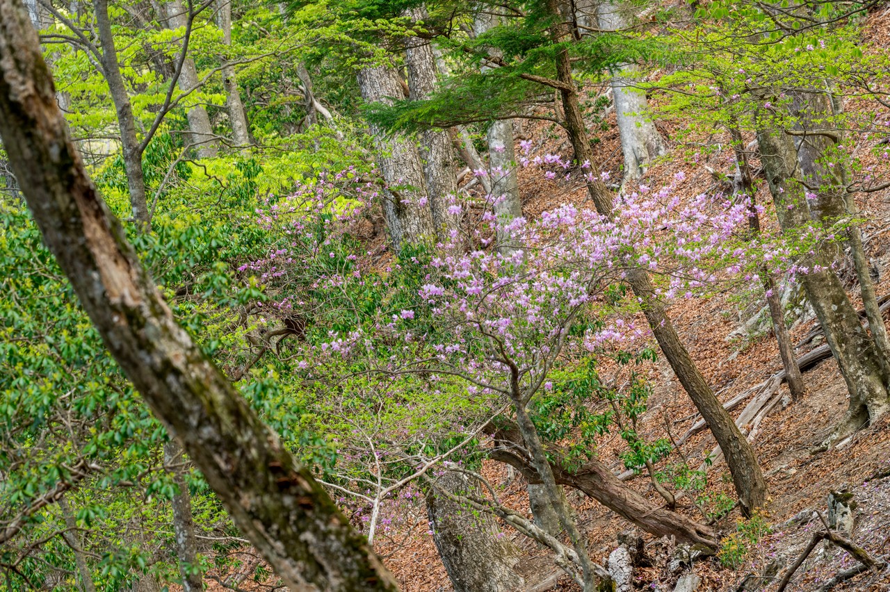 大持山を過ぎると、尾根の幅は狭まり岩場が出て来ました。アカヤシオは主に日当たりの良い岩稜帯に咲く花なので、そろそろ現れても良さそうなものですが、まだ見当たりません。