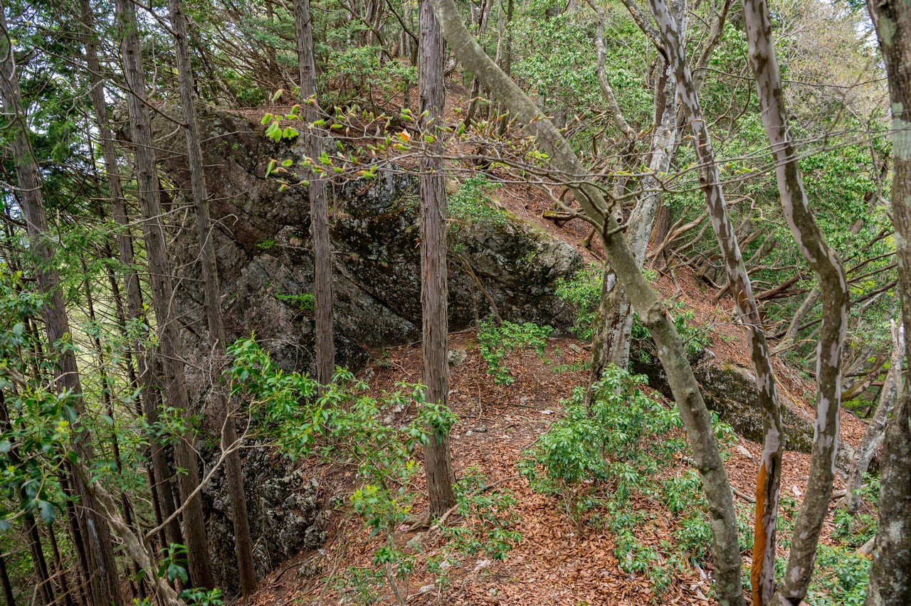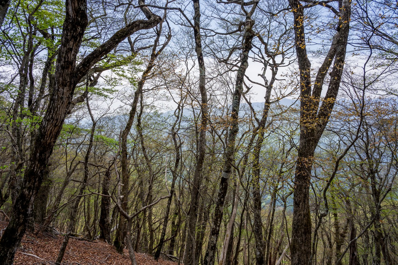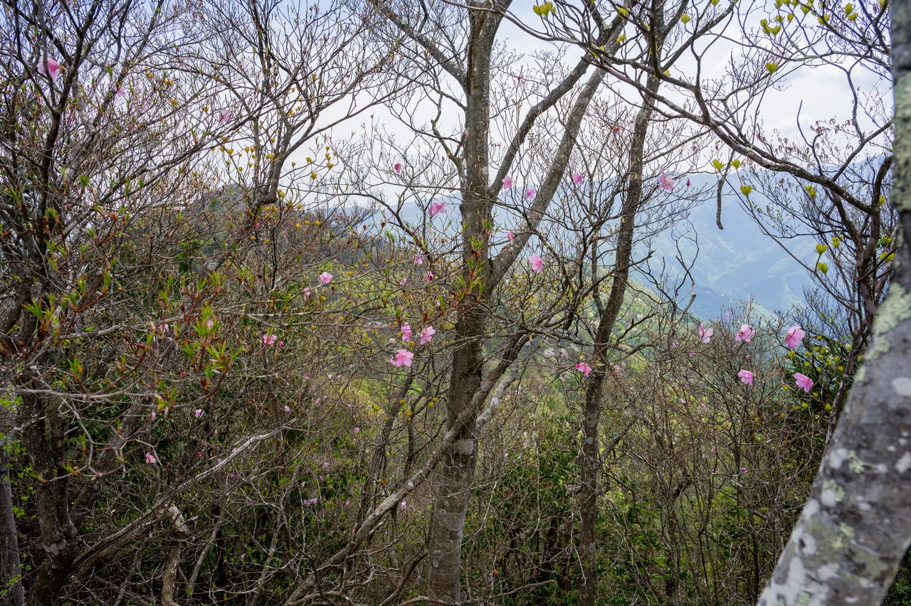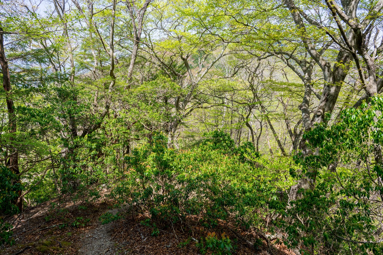 大持山を過ぎると、尾根の幅は狭まり岩場が出て来ました。アカヤシオは主に日当たりの良い岩稜帯に咲く花なので、そろそろ現れても良さそうなものですが、まだ見当たりません。