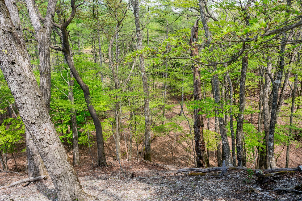 天神山の山頂らしき場所を通り過ぎると、周囲はナラやブナなどの広葉樹だけの森になりました。この辺りは紅葉シーズンに歩くと、とても良さそうです。